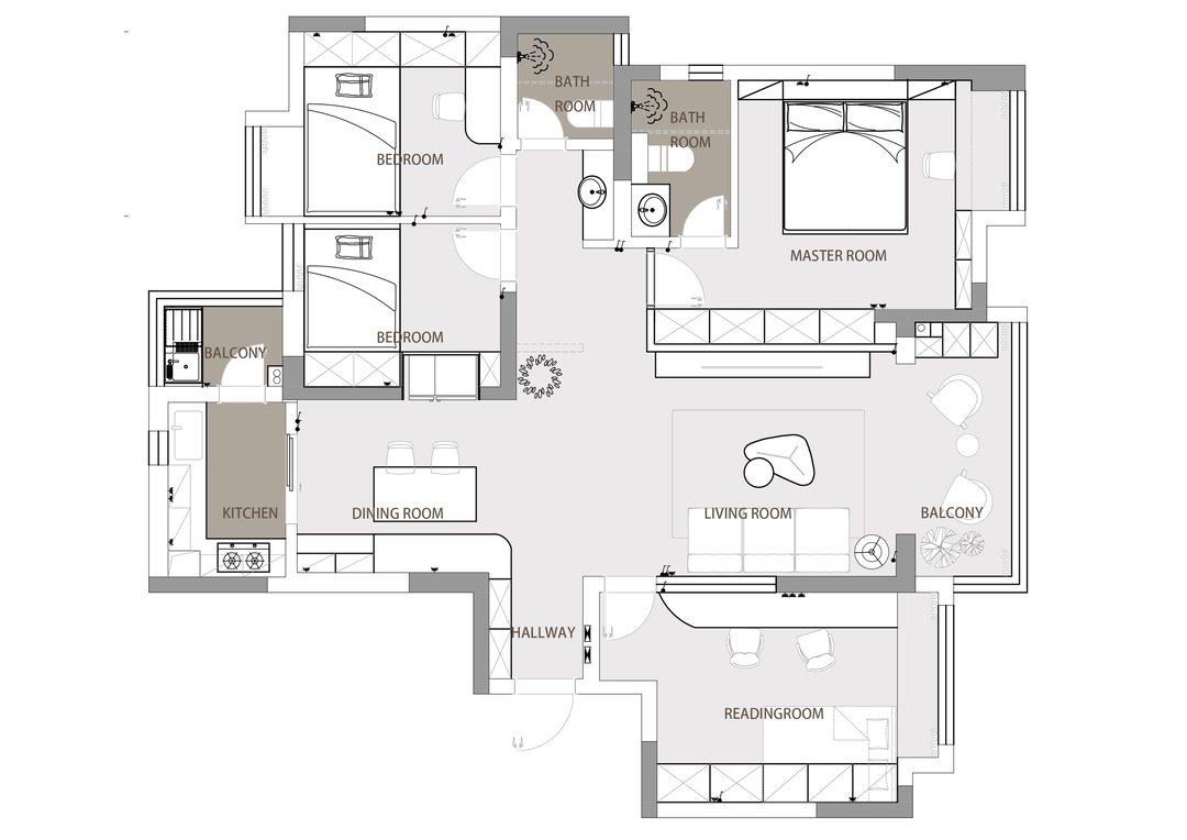 飘窗位置也通过同色的窗套勾勒出框景,端出藤编茶几,摆上茶点蜜饯,半倚在窗边,享受属于自己的闲暇时刻。