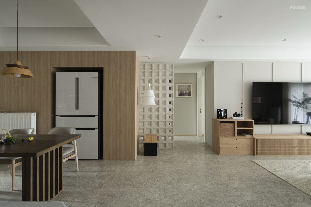 结合屋主的需求以及预算,我们在硬装上只做了局部的调整。将原有电视墙缩短,内凹出一部分空间给到主卧衣柜储物。并调整左右位置,通过错位手法在原走廊处增加水泥构件隔断,避免入户门直对次卫门,让狭长的走廊有一个迂回宽敞的区域。组合的MUJI式电视柜,能装又方便挪动。