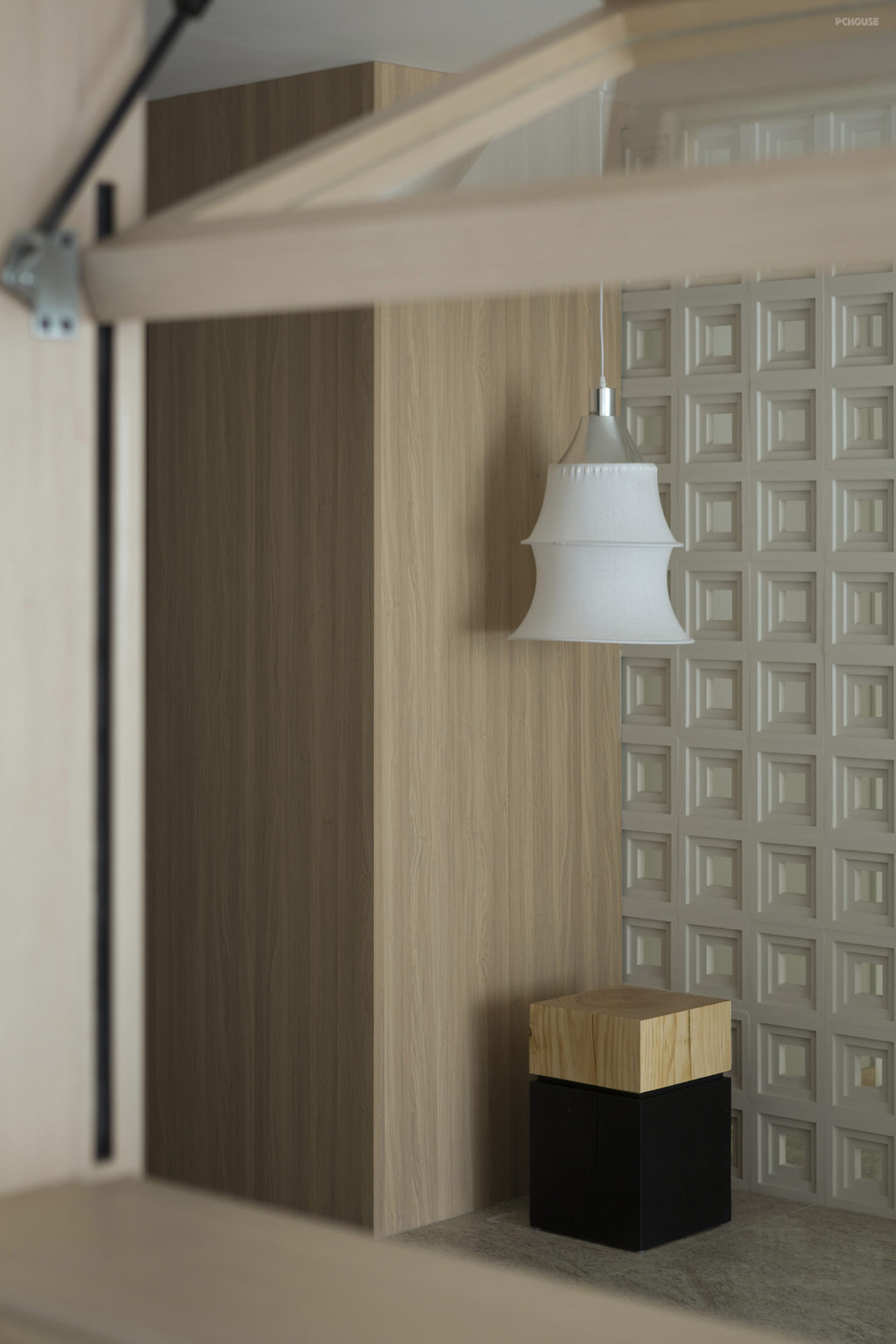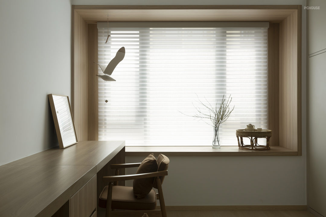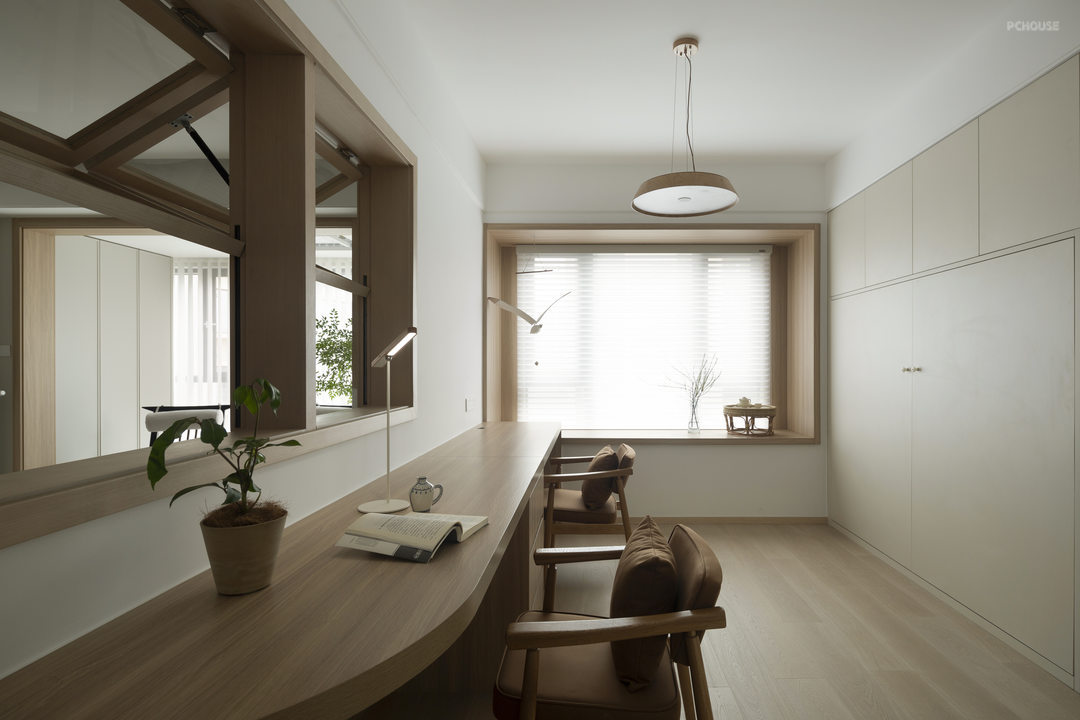 原本封闭的书房也通过折叠窗,和外面空间有了更强的粘性,后续在使用场景中的人能在不同空间感受到更好的互动与沟通。超长的悬浮书桌,柔软的皮椅,可爱的风铃,构成了两个可爱的年轻人集工作、娱乐、沟通一体的最舒服自在的区域。
