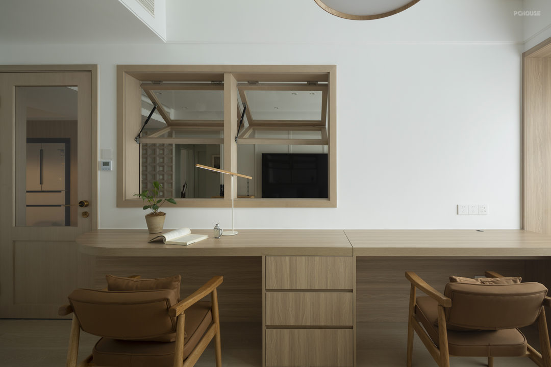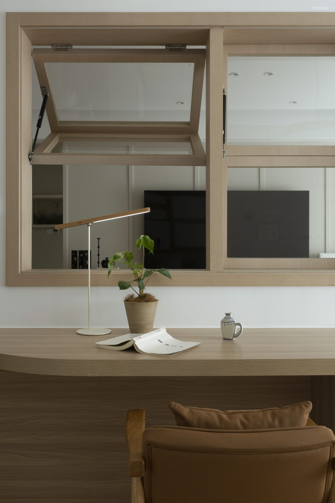 ②将书房墙体局部掏空做折叠上翻窗,形成半开放式空间。增加书房与公区的交互感与通透性。