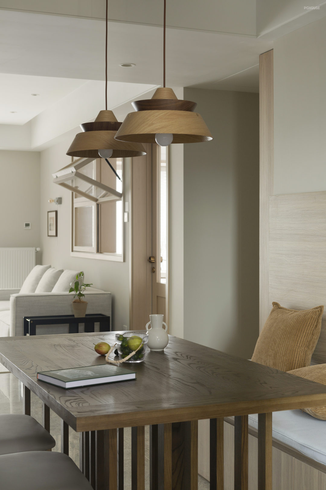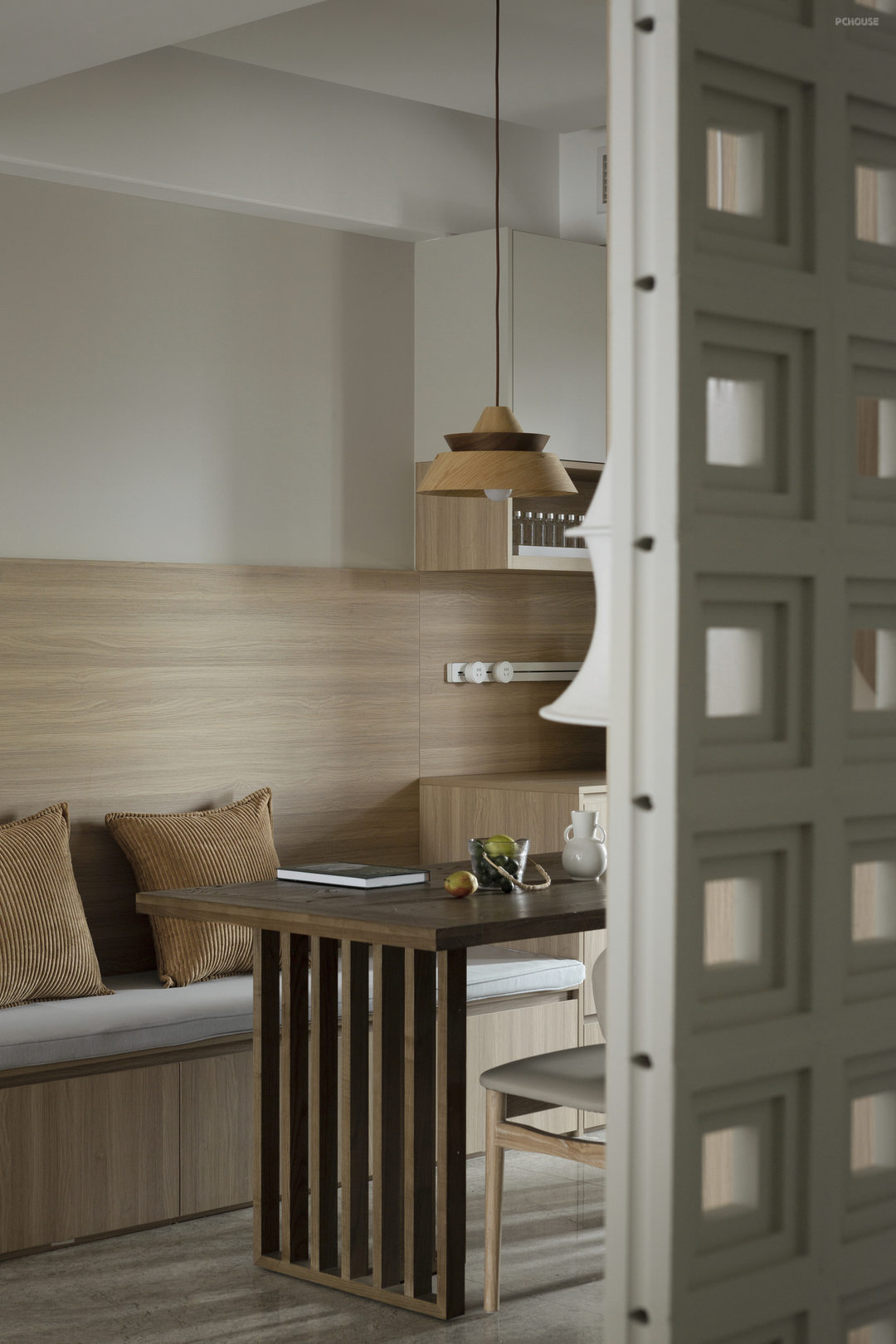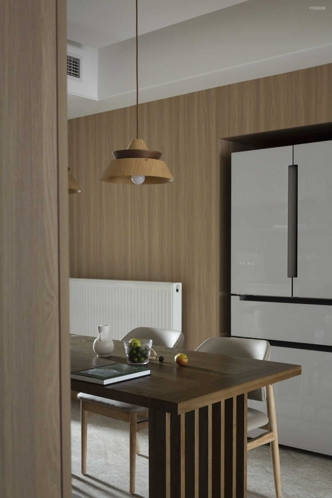 餐厅整个宽度尺寸不足,所以采用餐边柜链接卡座的形式作为餐区的组合形式,增加了收纳也满足多人就餐的需求,不同功能的区域通过定制柜体达到了色彩和材质的统一。原餐区的射灯位置也改为垂吊下来的木质吊灯,让近距离的灯光去照亮餐桌上的菜肴滋养每一个辛苦劳累归家人。