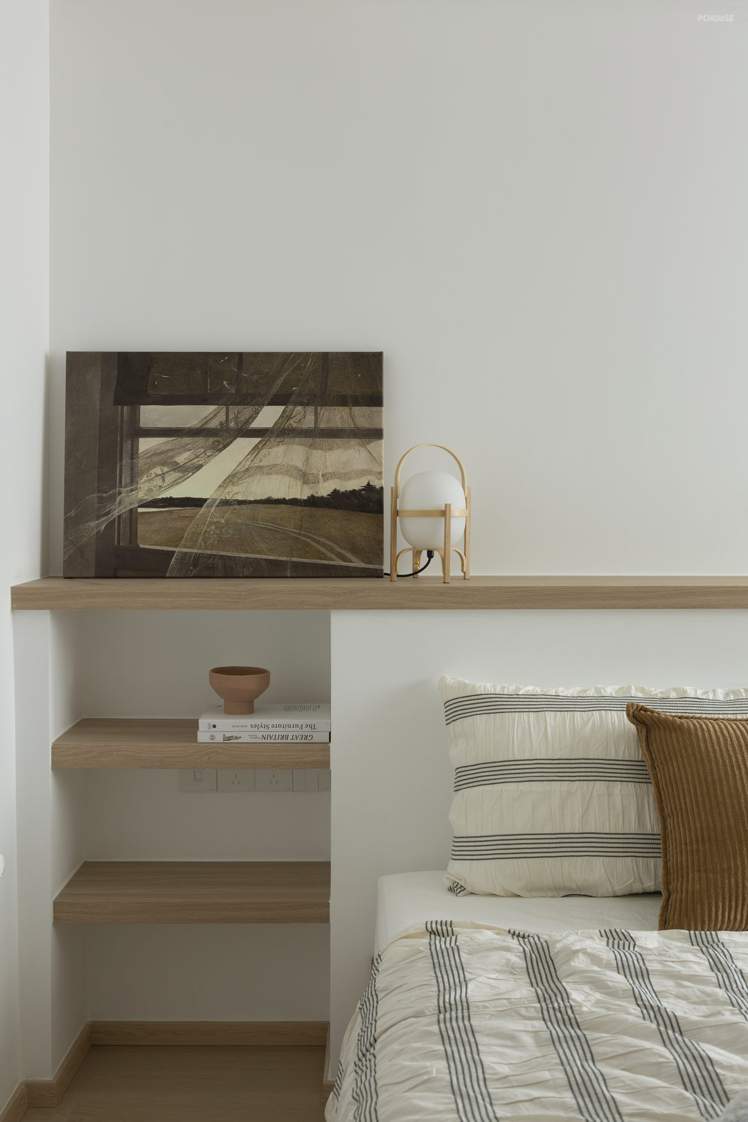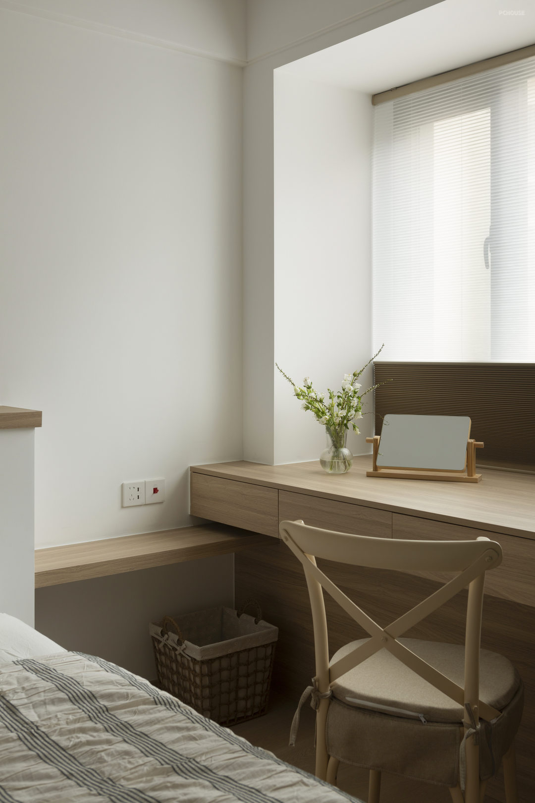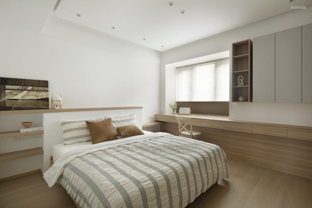 原本飘窗的位置根据其高度增加了其深度做成了一体式的妆台,链接床尾衣柜的位置又有一排窄且浅的化妆品收纳柜,真正做到了物尽其用,让每一个功能区都有服务于它,且直线距离最短的收纳。床尾因为借用了原客厅电视墙的位置,所以有一整排的衣柜,跟不能敲的承重墙一起做了木饰面。且都保留了上下留缝,视觉上延长了空间又整体不琐碎。
