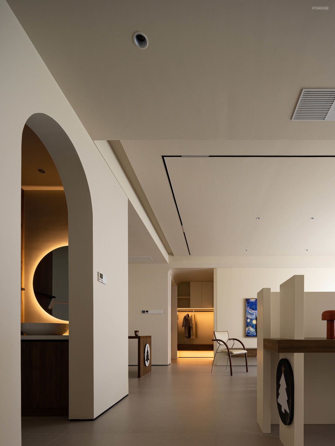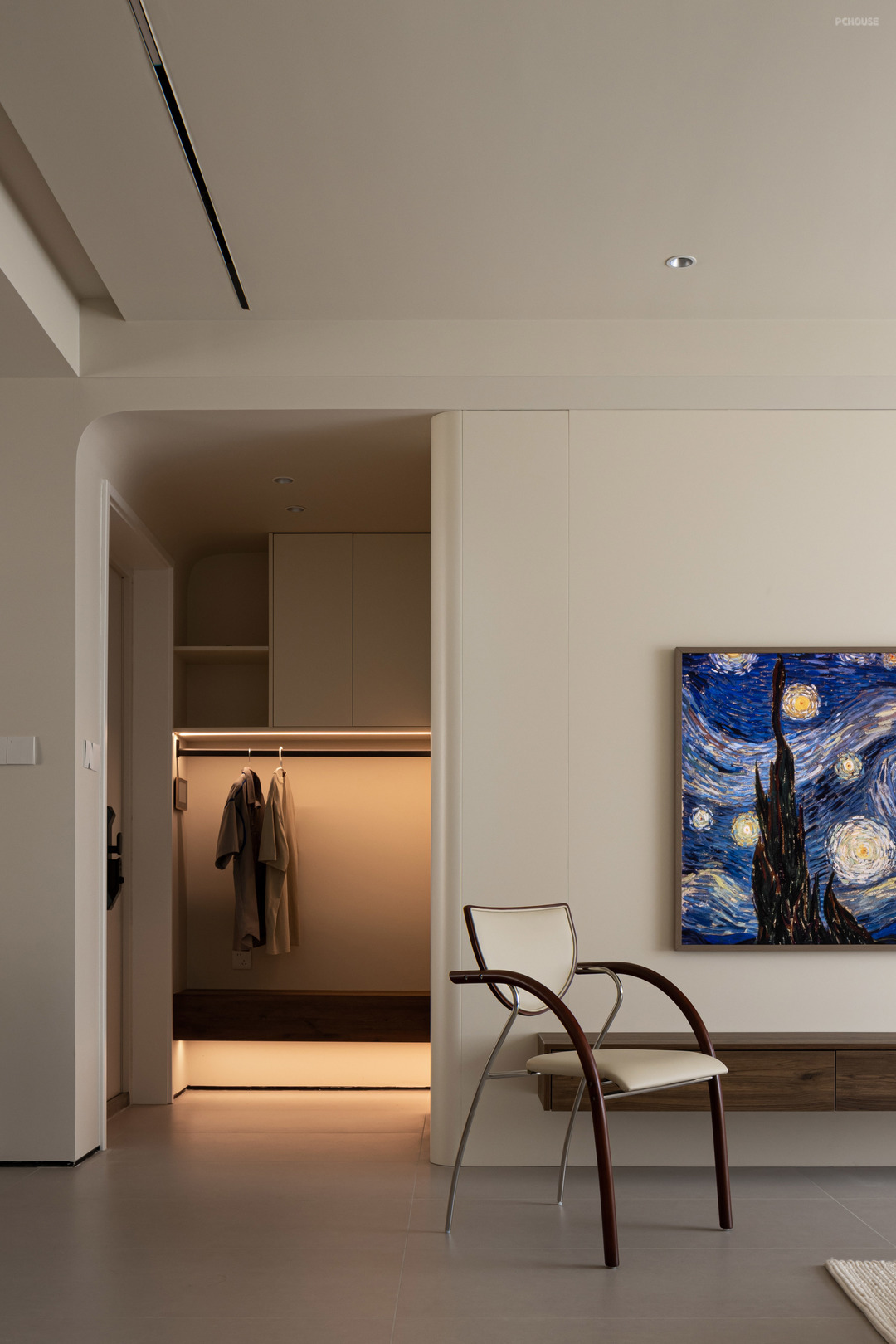 半开放的入户衣帽柜悉心照料着归来的人,置物收纳、静衣换着方便体贴,柔美的灯光氛围营造出温馨的气氛,整个空间被干净清爽的舒适感包围。