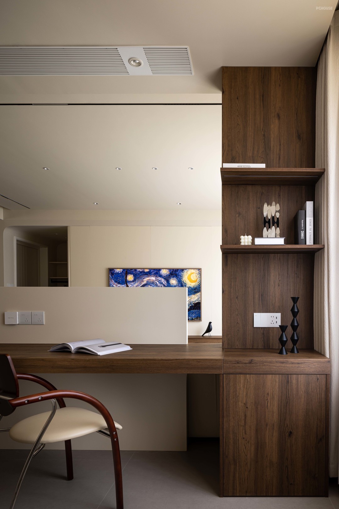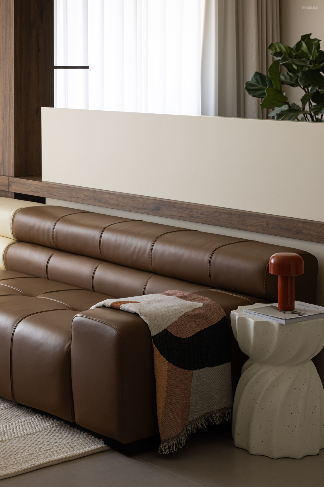 胡桃色沙发背板铺陈立面,将建筑承重墙体以另一种表达方式展现,书桌桌面一直延伸与其交汇穿插,削弱刚硬线条之余也将立体构成的设计风格得以延续,兼顾功能需求与生活美学,将起居与书房空间的功能融合,强调人与人、人与空间、空间与空间的对话。