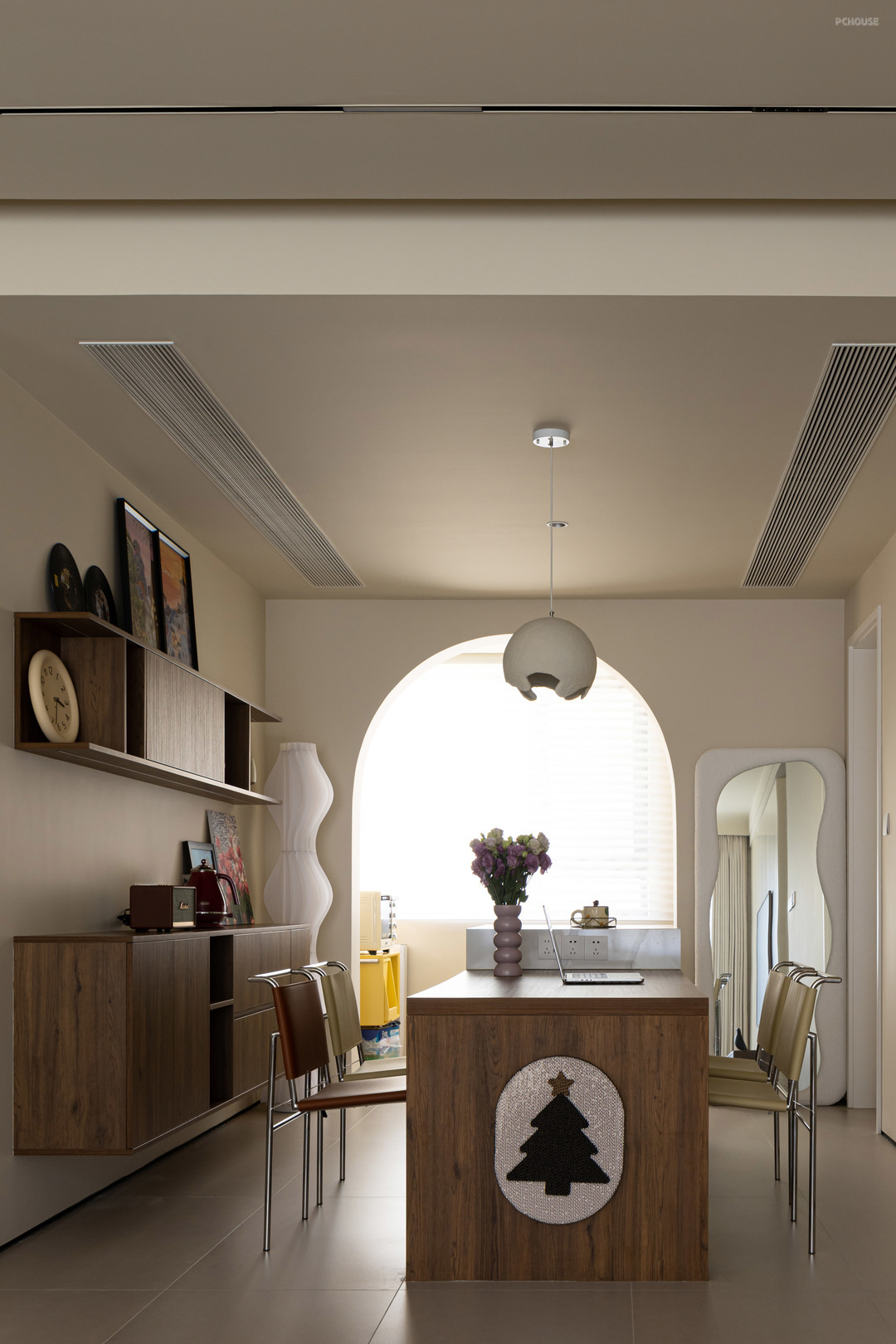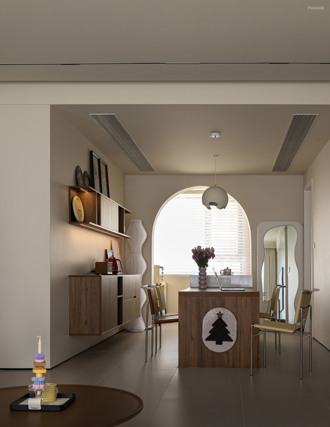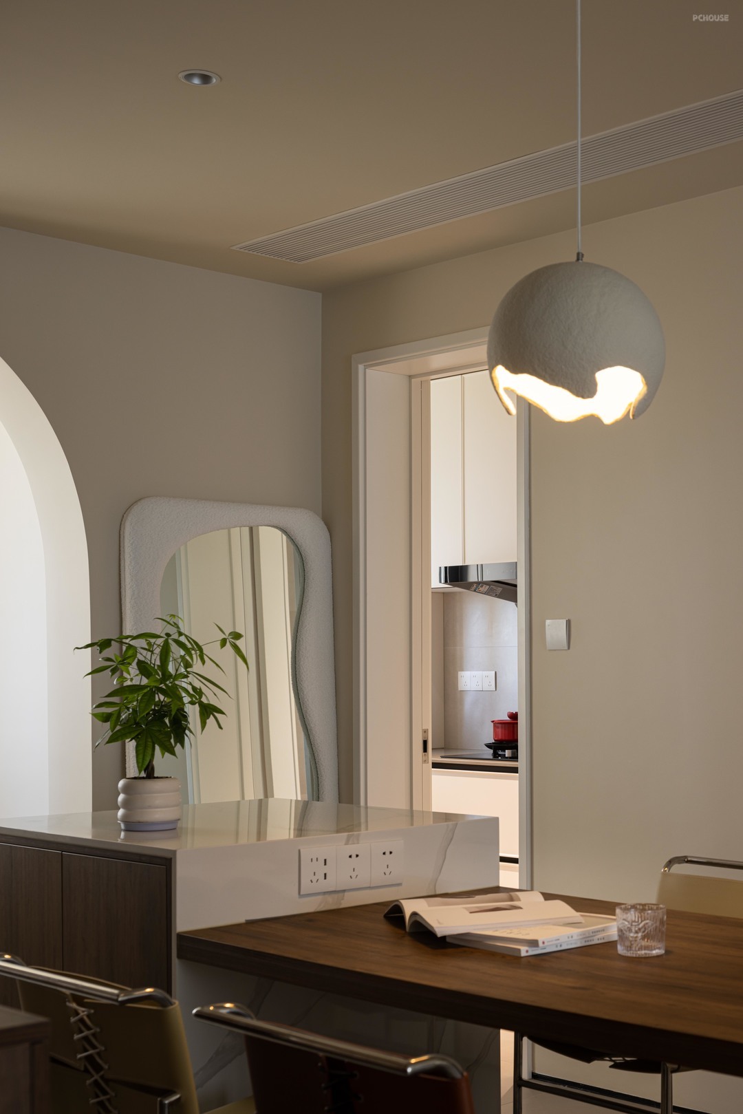 悬空的餐边置物柜搭配角落花瓣地灯,照亮一家人温馨飨食片刻,圆弧型典雅的阳台洞口勾勒出空间的柔美气韵。