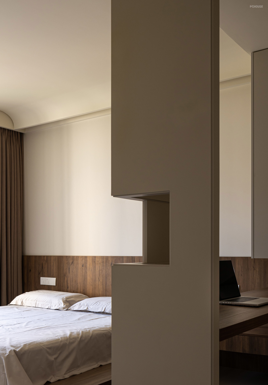 床头背板以同款胡桃色打底,呼应整体材质与色调,一直延续至衣帽柜。开放的衣帽柜设计将光线引入,展现精致而不凡的品味,梳妆桌与衣柜再次穿插连接,实现采光、收纳、梳妆、睡眠的完备机能,使卧室保持有条不紊的整洁与秩序感。