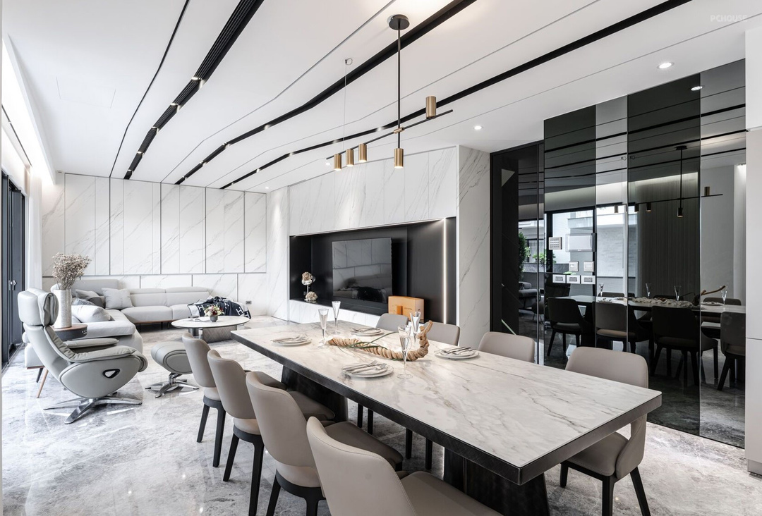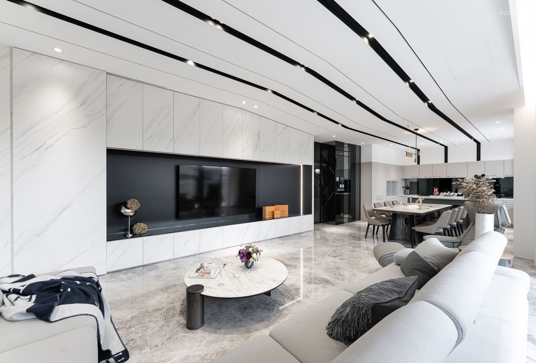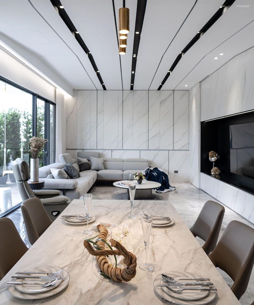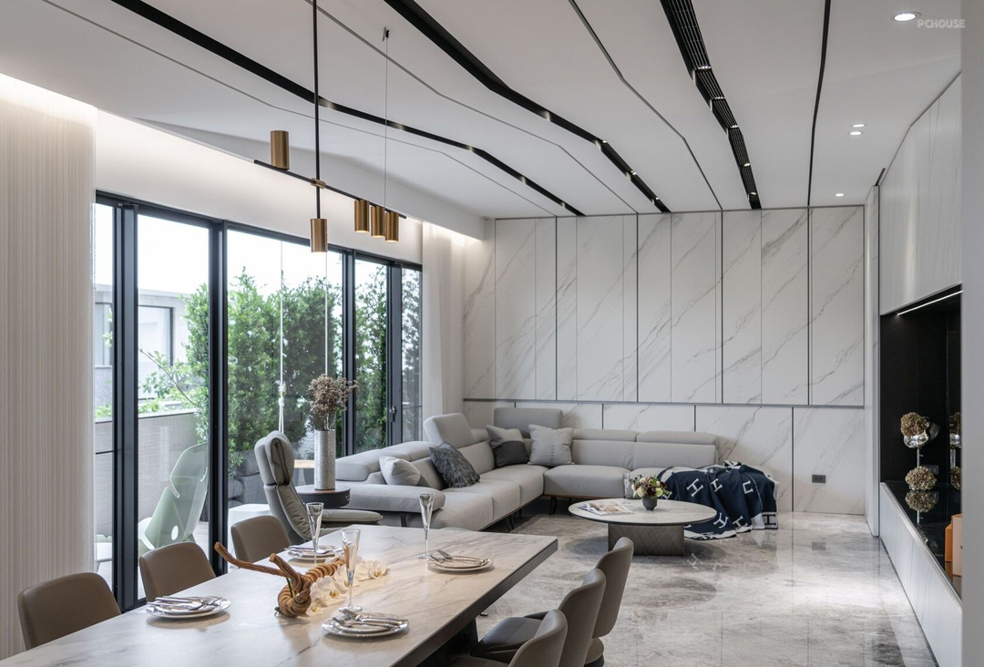 於廳區場域設計,利用建築縱身12米長的優勢,將客、餐廳、中島、廚房等區域機能,以同一軸線的開放方式規劃,並以連續開窗、線性天花設計,加深、拉闊空間主場氣勢…沙發後面以薄石板為主要材質,後方以隱藏門與儲藏室界定,以及充裕的收納機能;開放式的公領域設計,可以同時容納5-60人,滿足屋主好客的需求,更引入戶外寧靜優美風景,對應生活悠閒大器品味。