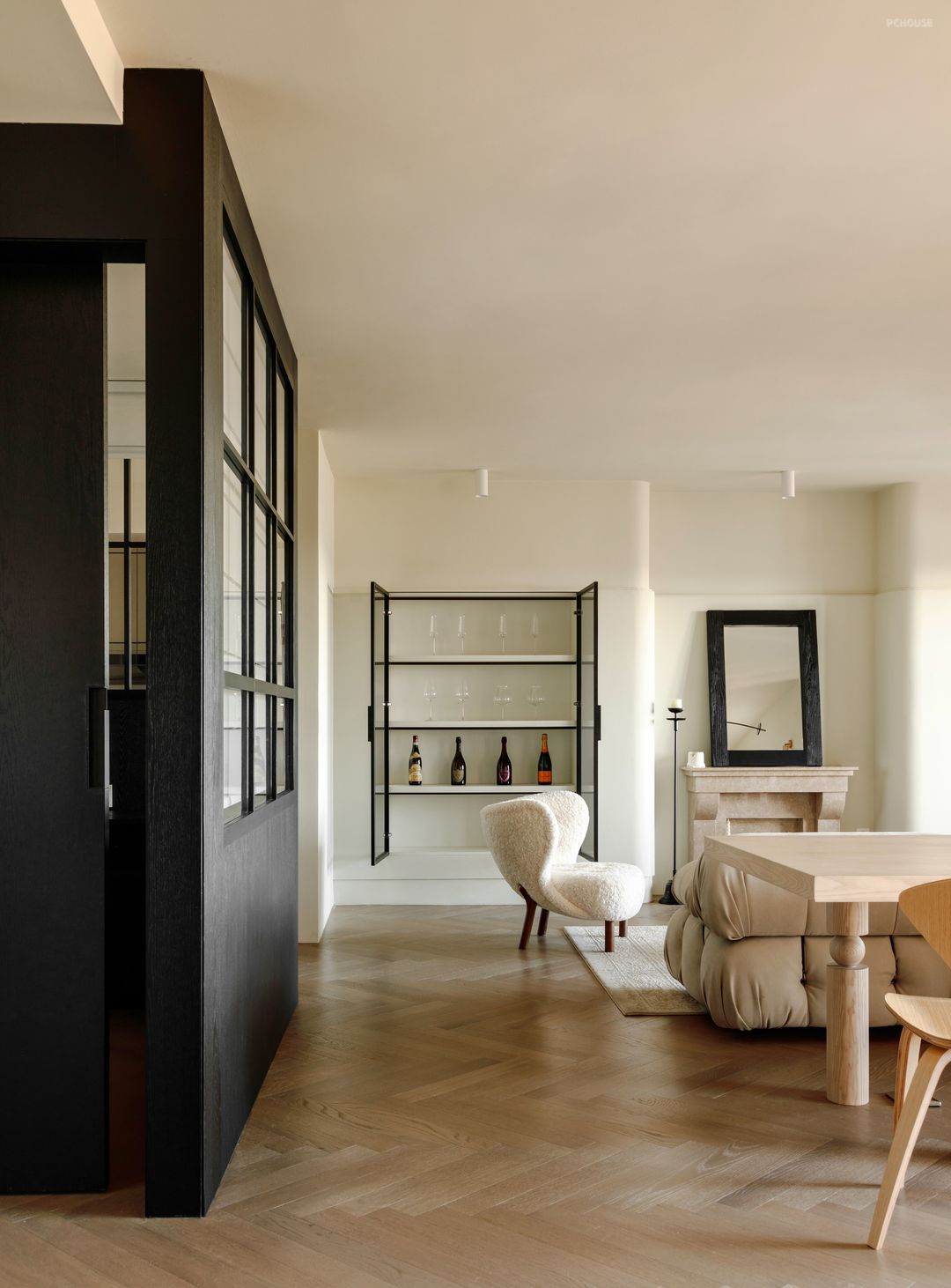 黑色实木贴皮哑光半开放漆饰面的“小黑屋”形成一个“盒中盒”空间。当站在书房中心,可以尽情欣赏厨房的繁忙与客厅的温馨,一方面,它与厨房遥相呼应,营造出一种空间的连贯感;另一方面,与客厅无缝融为一体,使整个区域呈现一种和谐的氛围,独立但并不孤立。