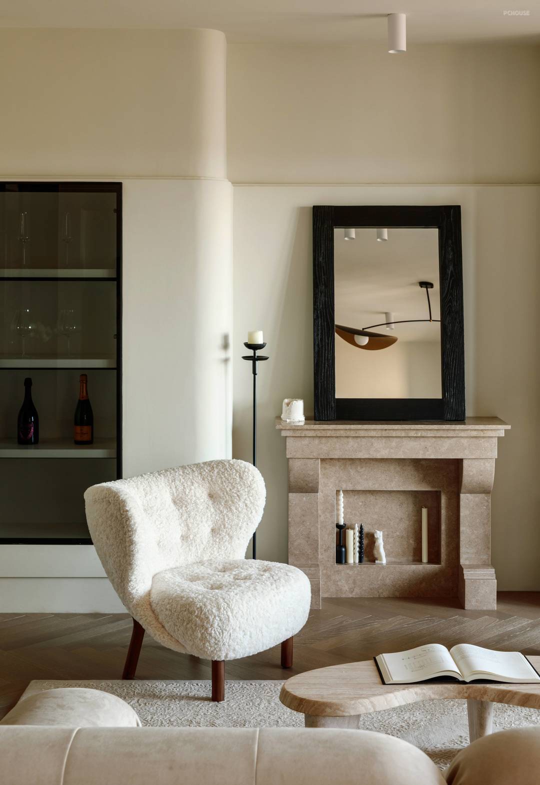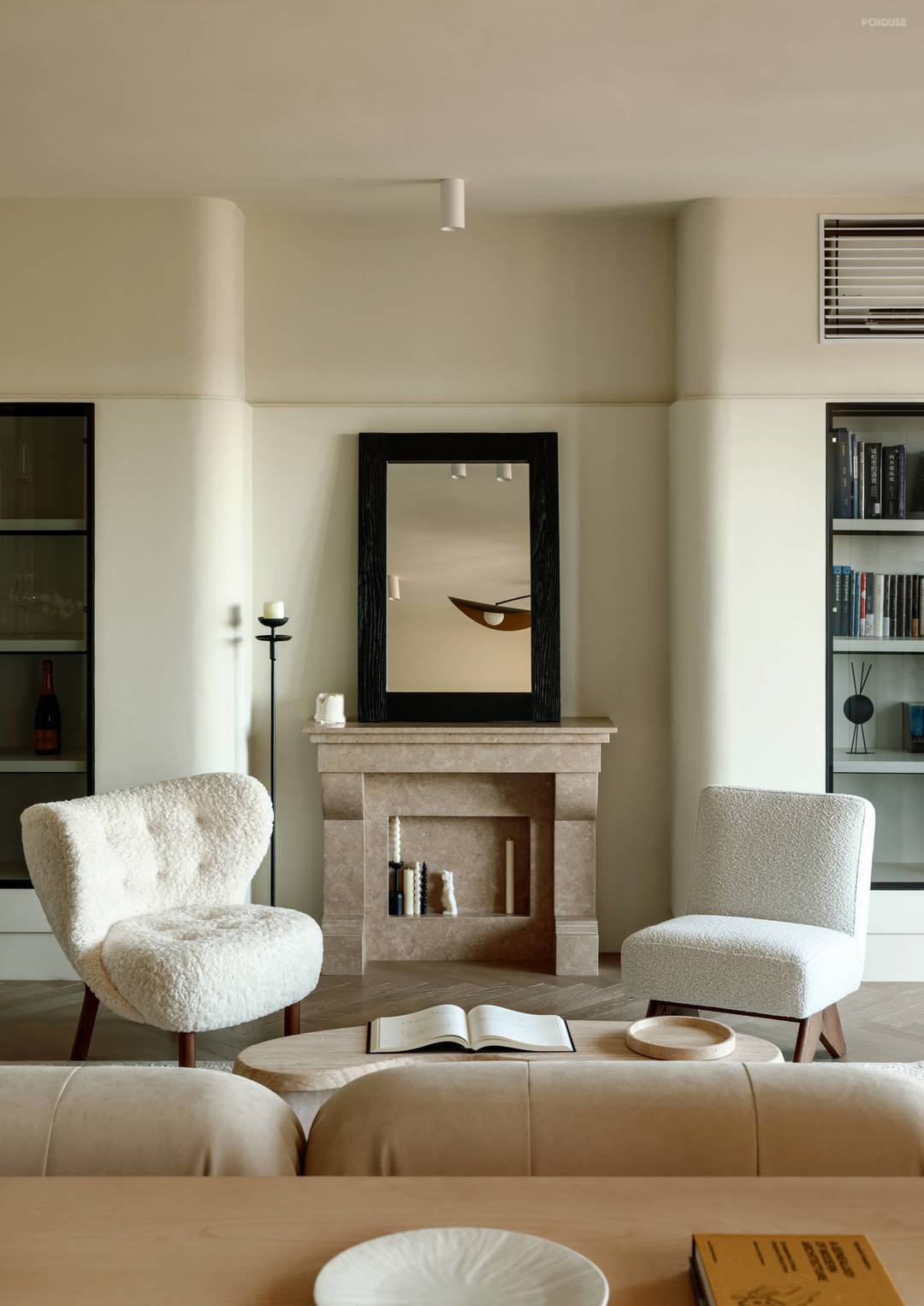 柔软细腻材质的单人椅与木色相配的洞石茶几增添了自然亲和的氛围,壁炉作为客厅具有空间凝聚力的元素,用天然石材一体打造,摒弃多余装饰,达到简约优雅的效果。