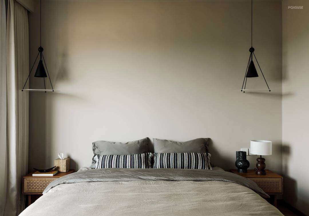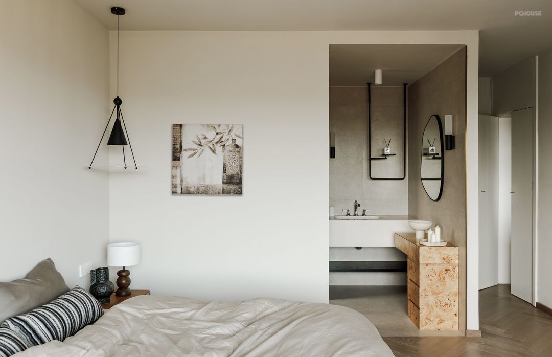 卧室作为房子的唯一的私密空间,独立卫生间和衣帽间的大套房,并且设计师定制的家具为卧室增添了独特的个性和温度,为业主提供了舒适宜人的休息场所。