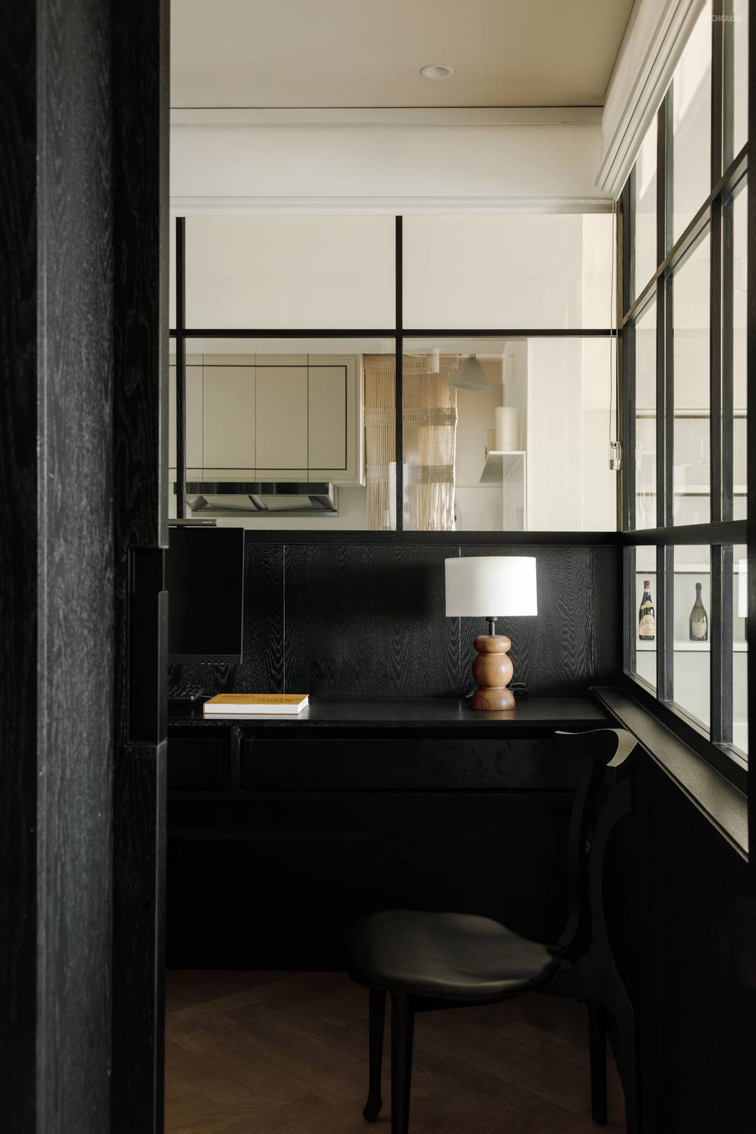 书房内部,设计师将黑木纹扩散到书桌和工作椅上,从视觉和触感上营造出沉稳而安静的氛围。