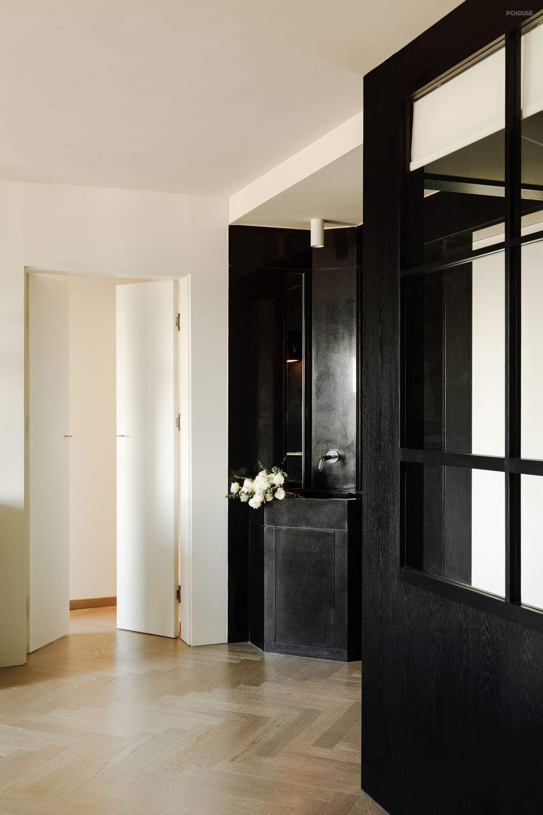 黑木纹肌理会让黑色的材质在不同的光线下会有不同的斑驳的变化和丰富的视觉效果,让空间更有质感。黑色也是后退色,大胆使用大面积的黑色,让人的视觉产生更深邃的空间层次感。