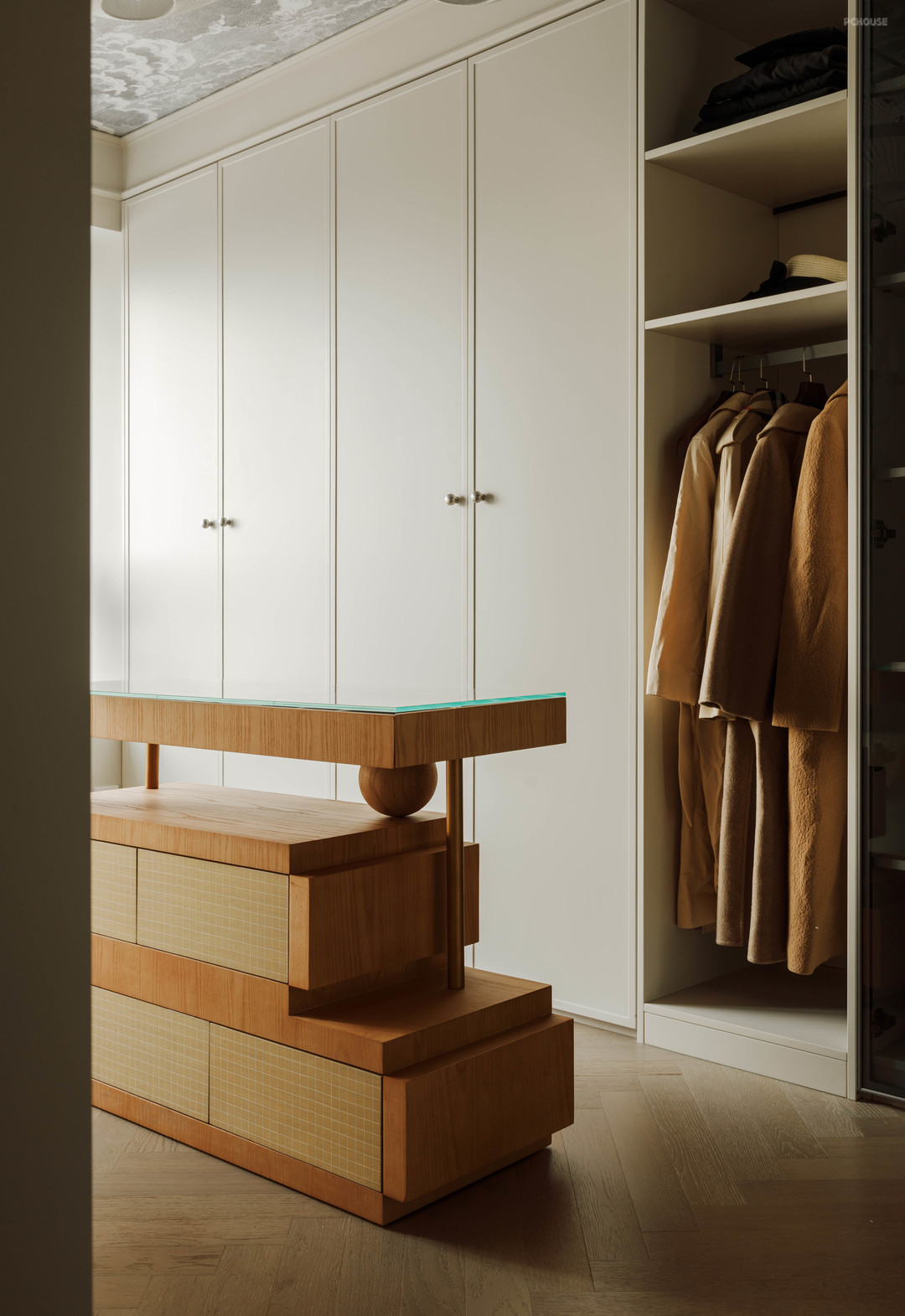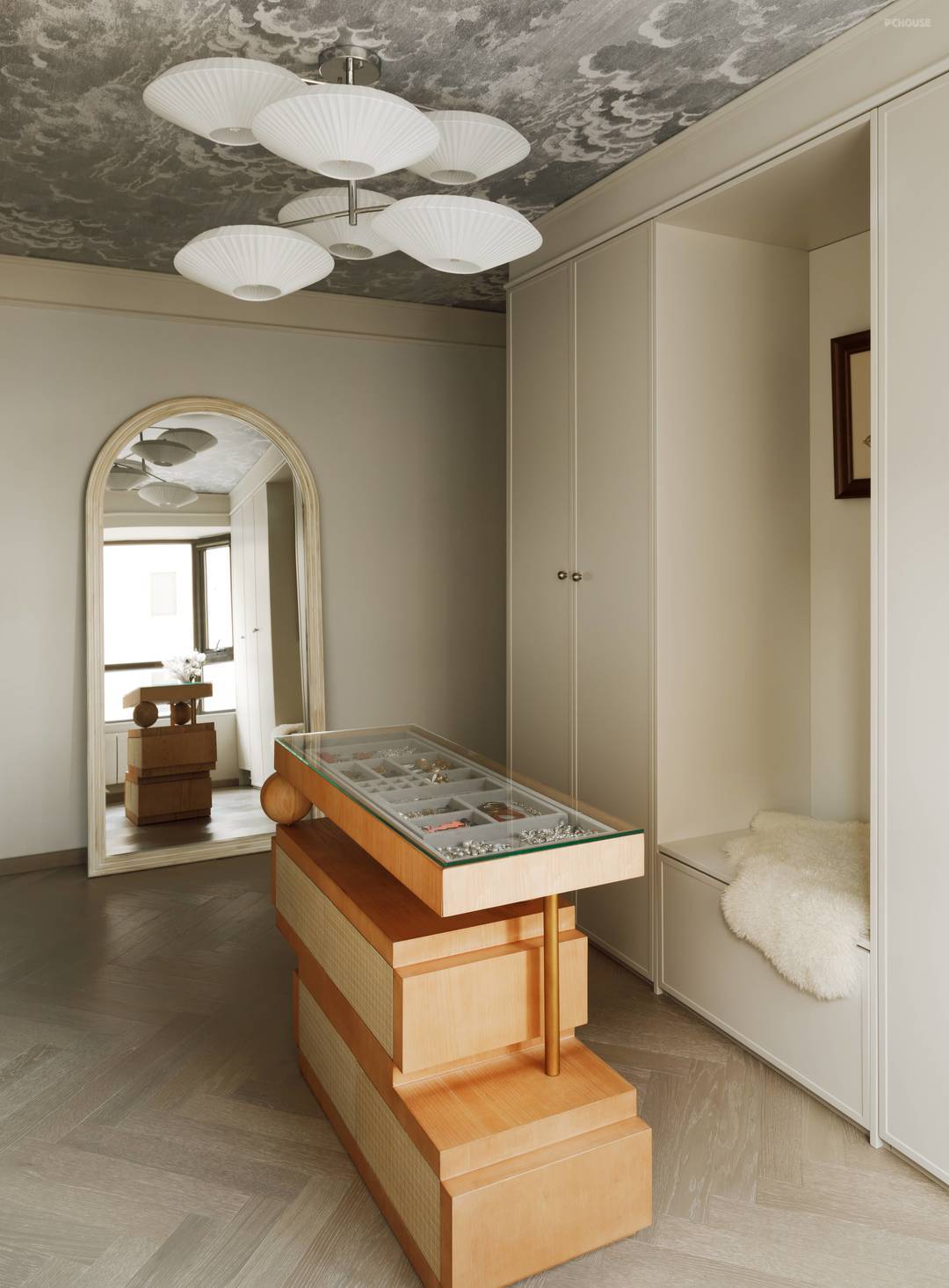 在软装陈设方面,我们注重氛围感的营造,天花壁纸和壁灯为整个空间带来了梦幻般的质感。设计师为衣帽间定制了一个首饰柜,采用了简单几何体的设计,拼贴木皮充满趣味。它不仅提供了收纳首饰的功能,更是在视觉上成为衣帽间的独特亮点。