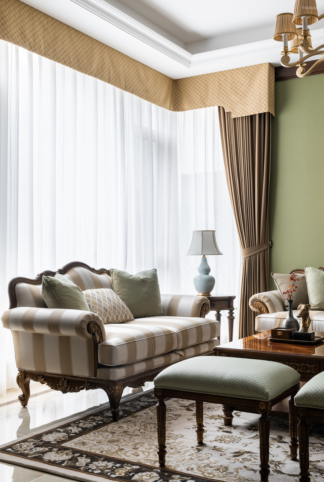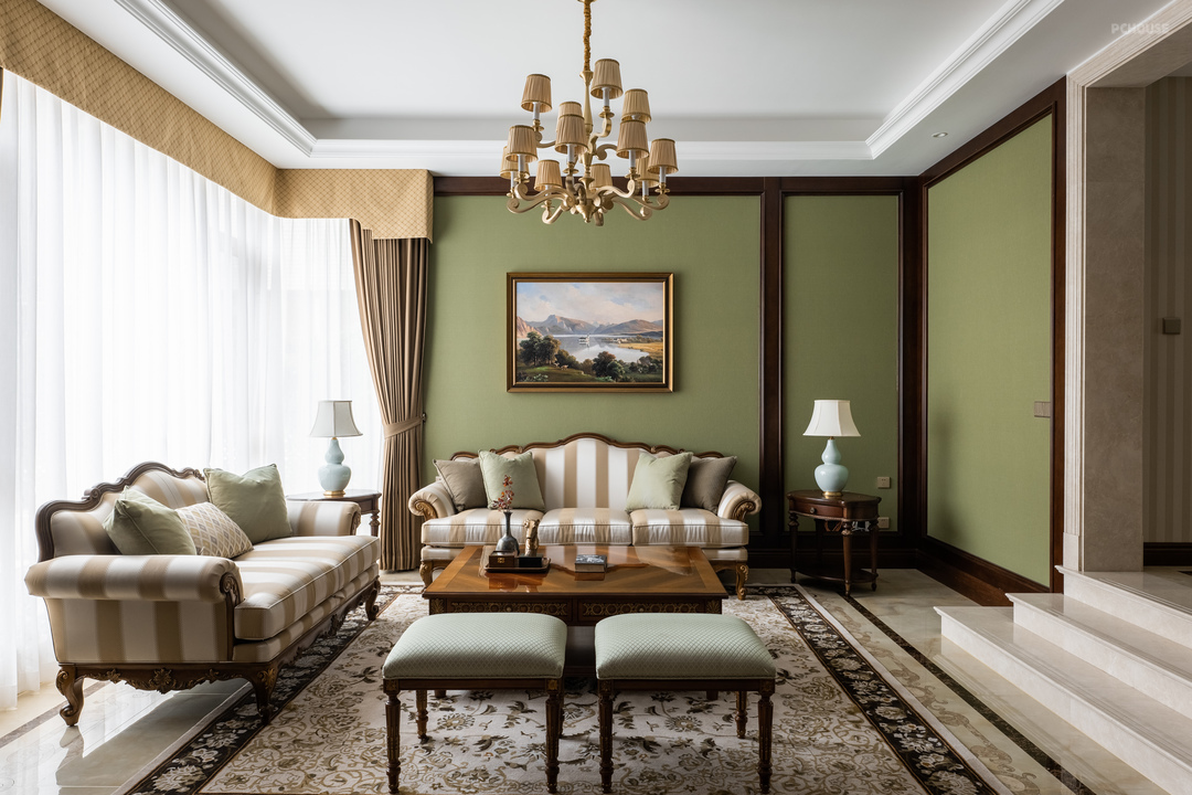 “格纹窗幔+电动窗帘”散发一股素净、文雅的复古气息。金,向来是华贵的代表。柔软、亲肤的印花地毯上摆着镶金实木茶几,精致入目。
