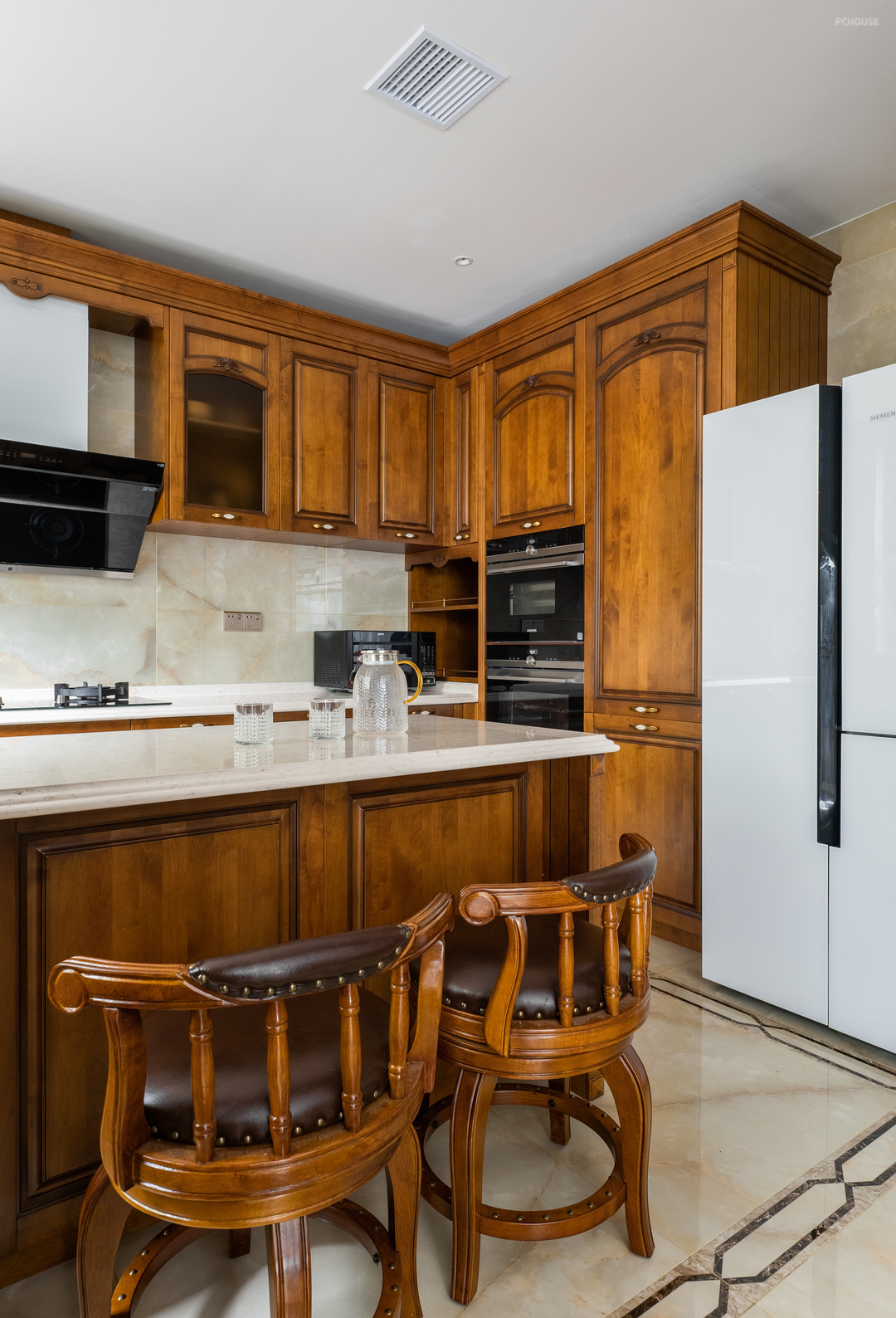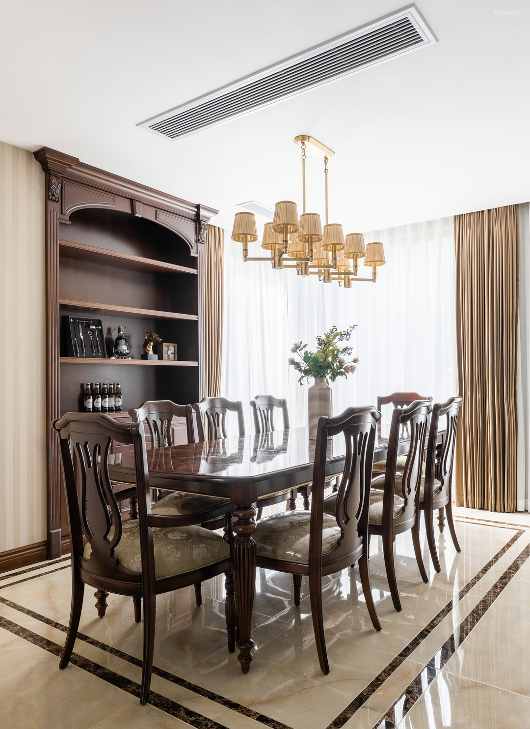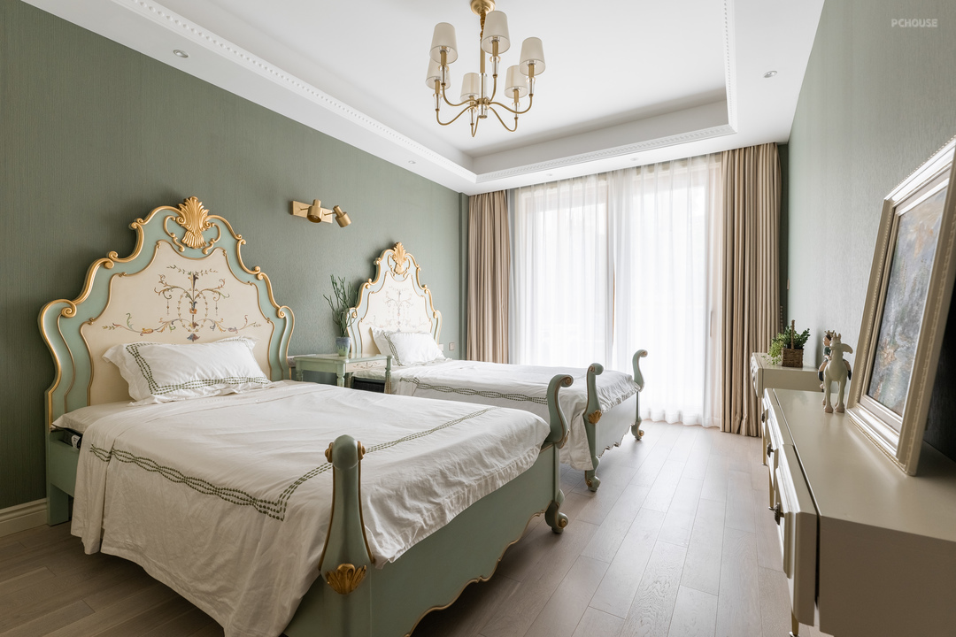 整屋风格以美式为主基调,冷静清新的蓝绿色、厚重温柔的棕米色、结合木质布艺、金属石材,打造实用清新与自由舒适并重的温馨美宅。