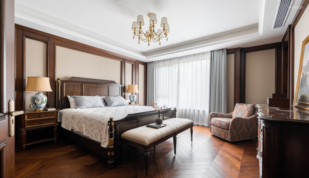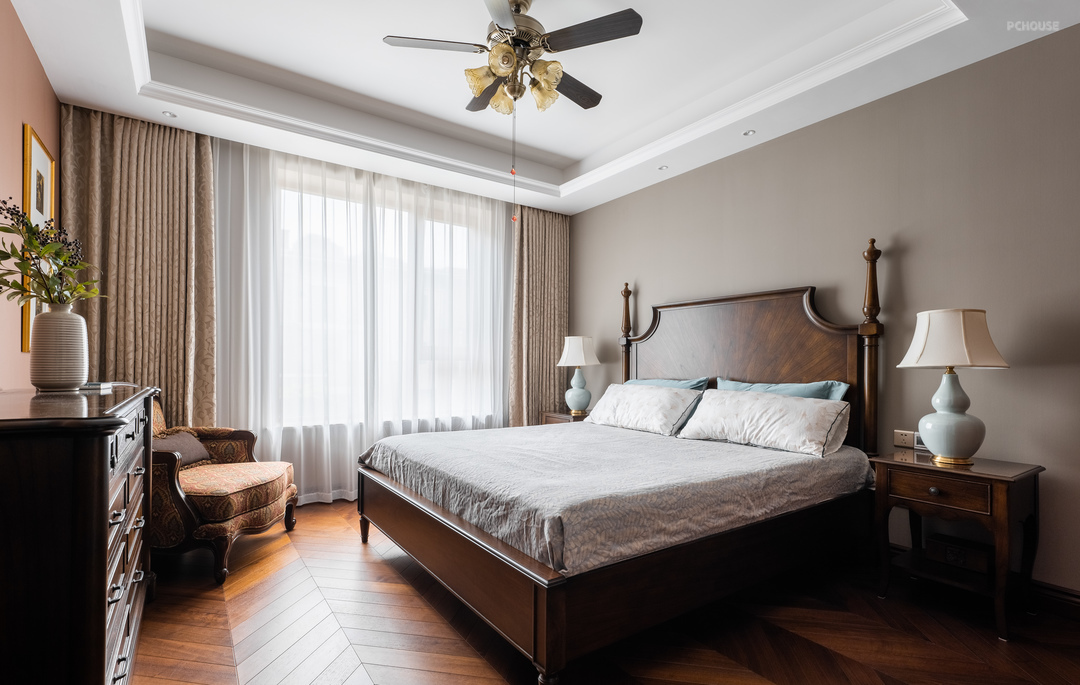 暖棕色调包裹的老人房,处处流露着关怀与体贴,考虑到老人吹不了空调的缘故,设计师特地挑选了复古精致的可变速风扇吊灯。