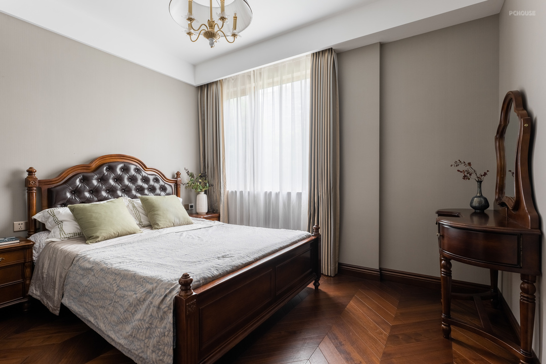 客卧的壁纸、窗帘统一为中性风的浅灰色调,家具皆是后期主人自购,方便偶尔亲戚停留小住。