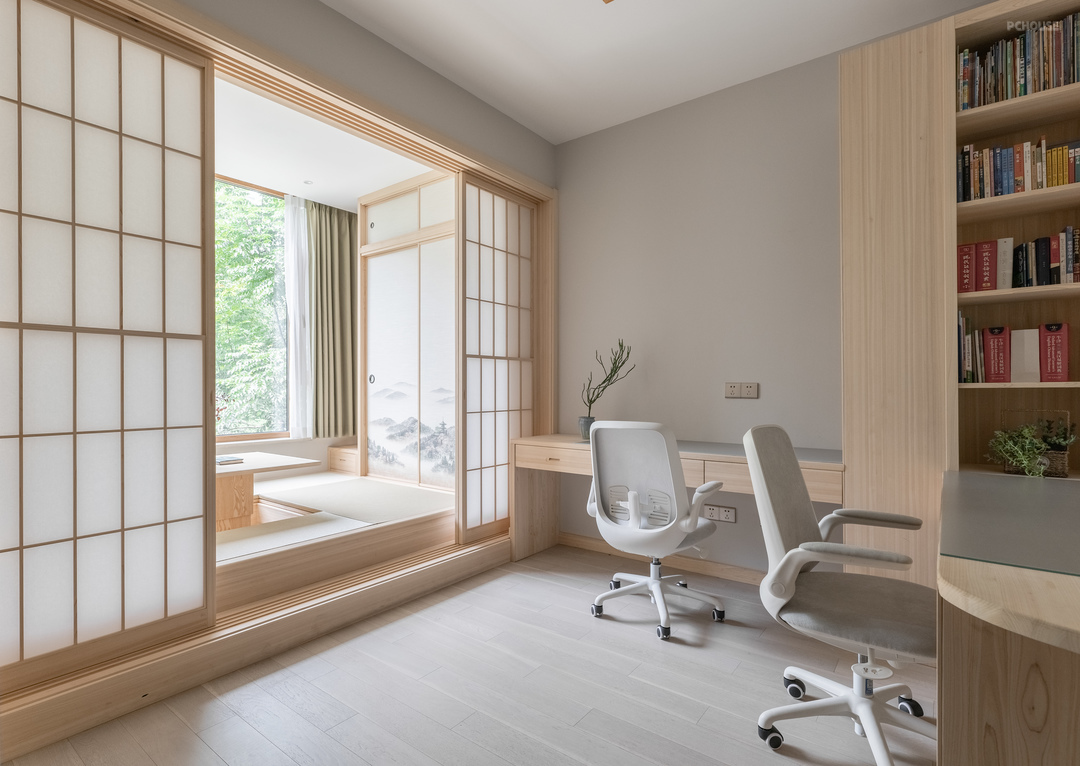 榻榻米多功能房被一分为二,一处是“浅灰+原木”的现代书房,用作双生花的课室;一处是和风榻榻米,用作放空冥想、休闲收纳。
