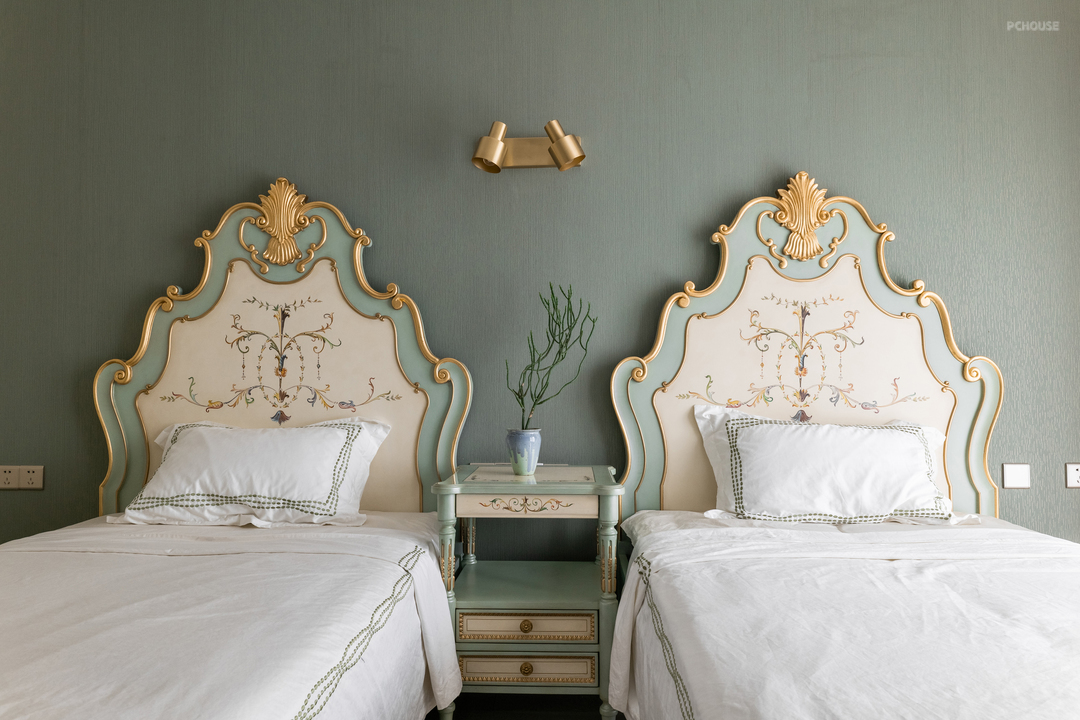 卧室墙面是淡雅简约的米色壁纸,再以胡桃木饰面做线框处理,使之富有层次,饰有天鹅的瓷瓶台灯可谓点睛之笔,活灵活现。