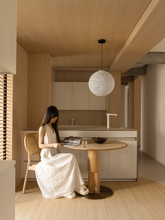 餐厅墙面不到顶的处理,同时装饰板与墙面形成脱离关系,让餐厅的体量变轻,空间显得更开阔。