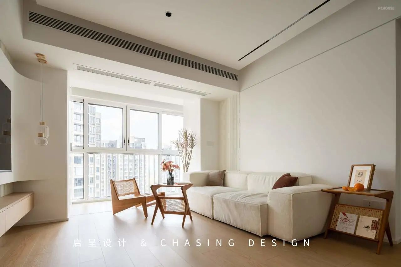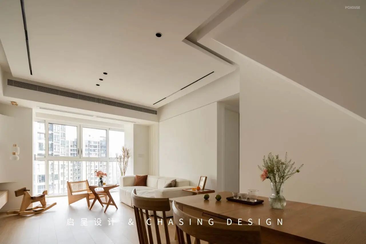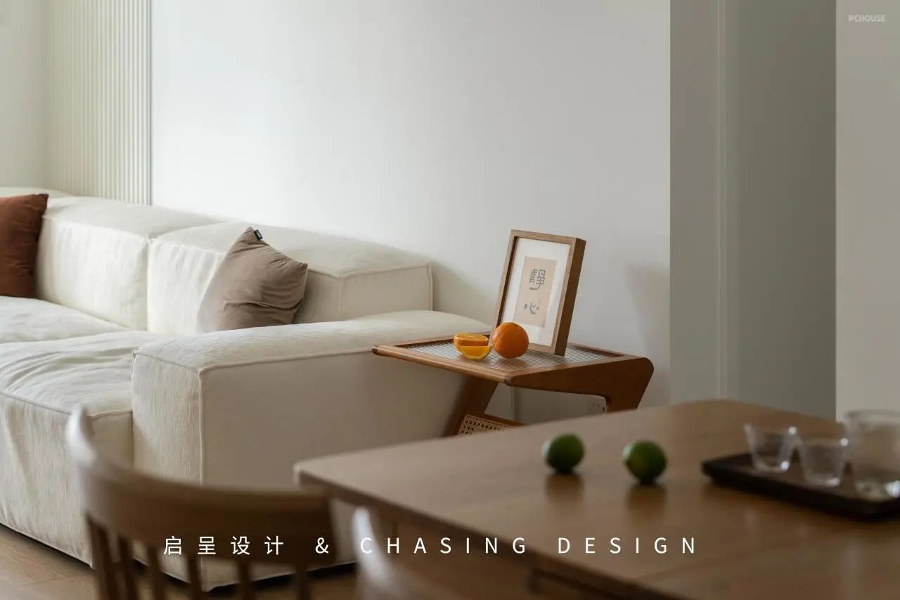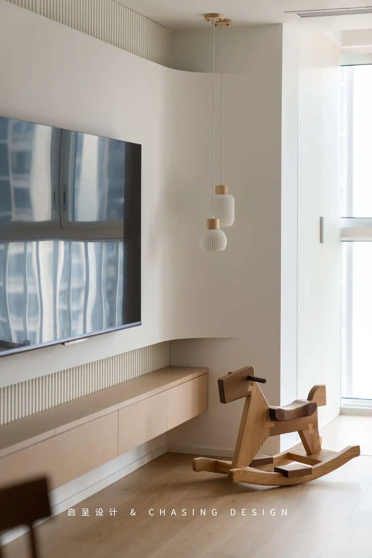 本案从空间本身出发,将业主的爱好在空间里放大,未刻意去做空间硬件功能,着重于休闲舒适的生活体验;木质元素与纯白相互交织的情绪蔓延着静谧的治愈力。