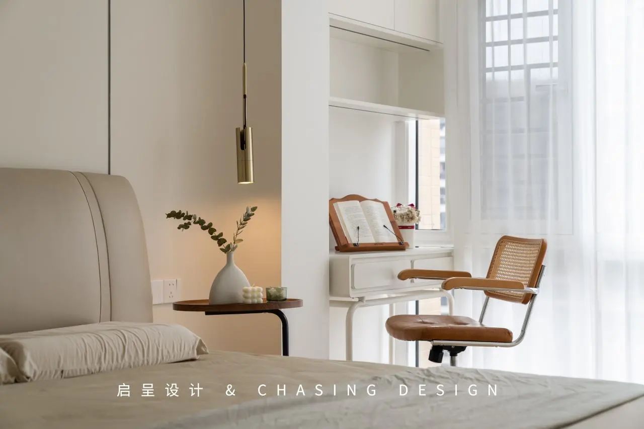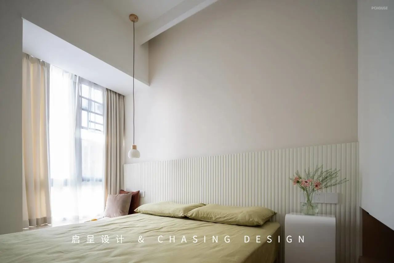 以原木色、可可蛋奶加以爵士白营造淡雅的睡眠空间。