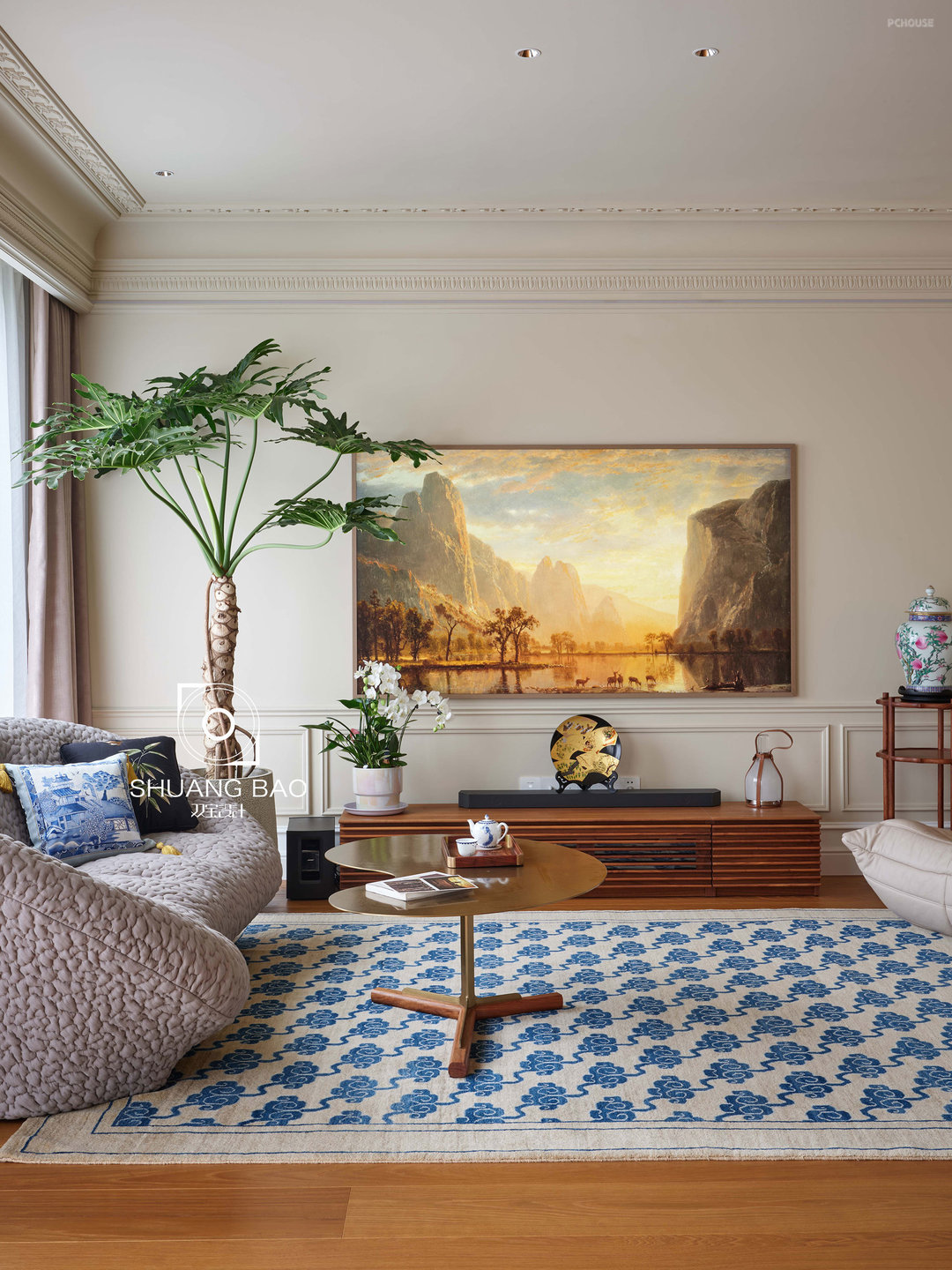 一整面落地窗让自然光线充分洒入,空间整体色调温暖柔和,墙面精致的法式雕花,传递着浪漫优雅。法国Ligne roset沙发上,亭台楼阁抱枕以青花色配泼墨山水画,赋予空间深沉柔美的气质;绿色金竹搭配黑色丝绒质感的巴山竹夜抱枕演绎着中西合璧的诗意。设计师精心挑选的落地植物龙鳞春雨,让家更显生机蓬勃,还喧嚣的城市背后一片舒适、宁静