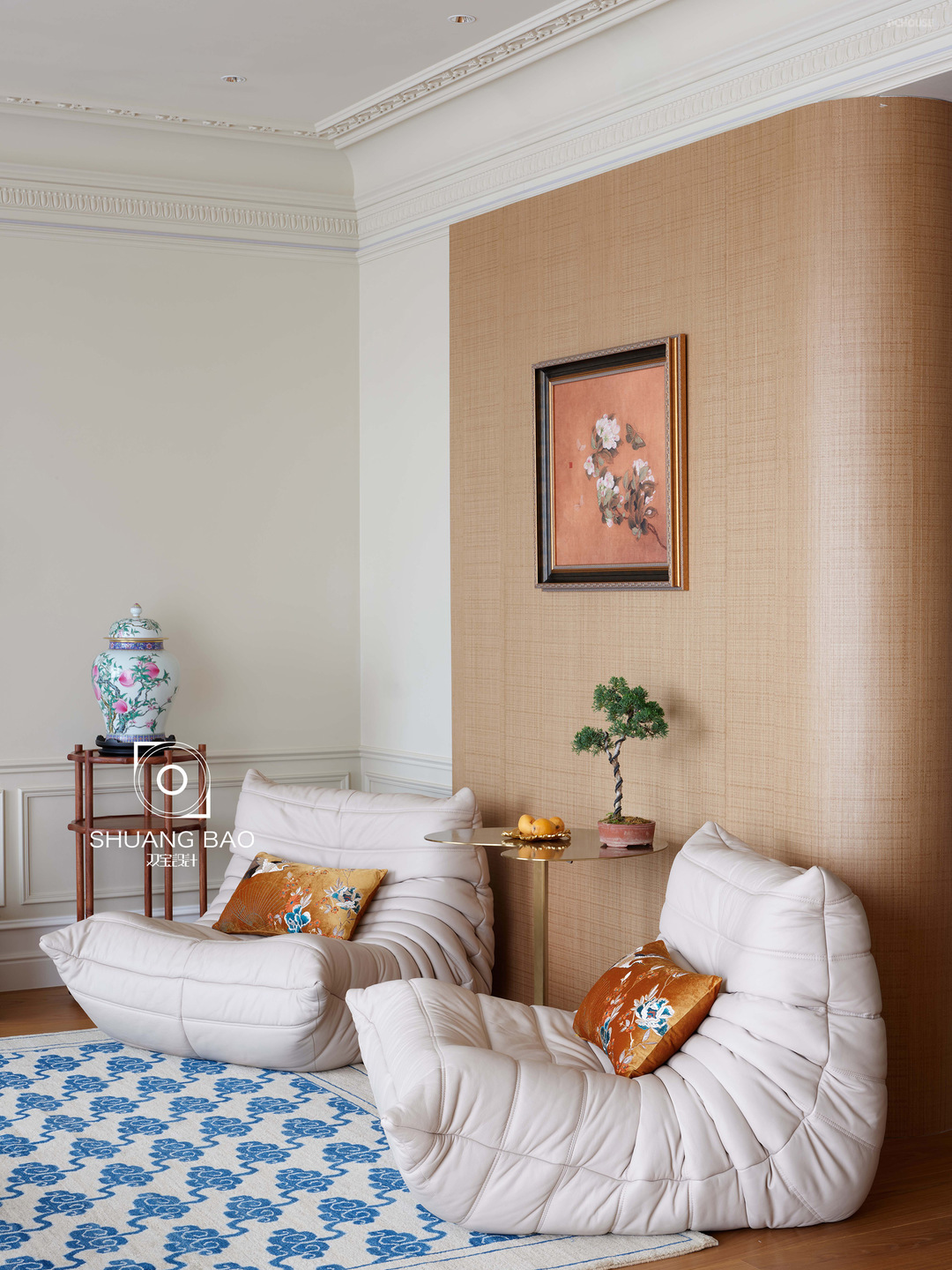 设计师以弧为形设计的隐藏式鞋帽区,满足日常储物量的同时使用适当的木饰面,让空间显得更加温润舒适。重工的仙鹤立体刺绣抱枕,极具东方美学和复古气息,以含蓄且秀美的姿态营造温馨的居家氛围感