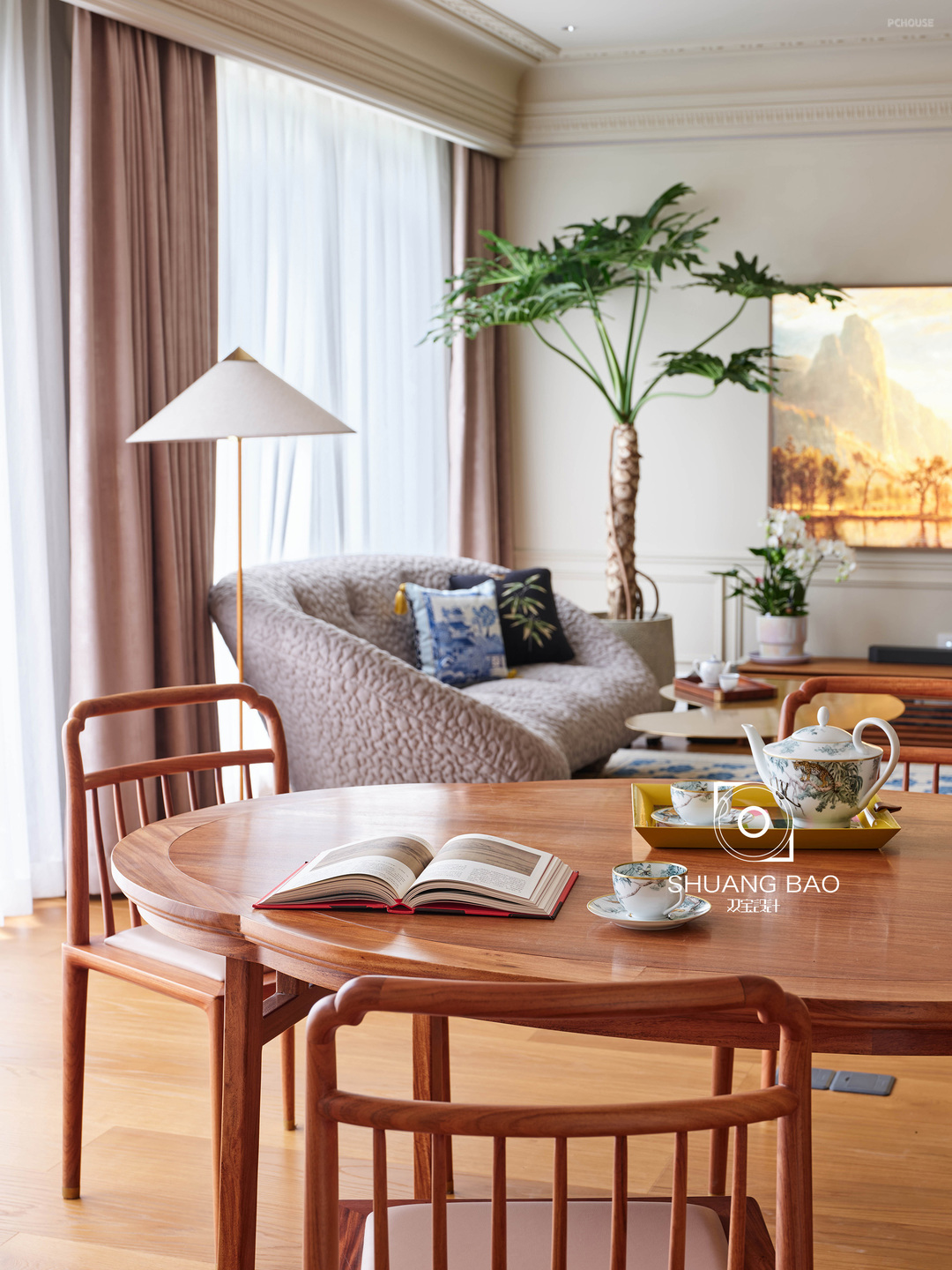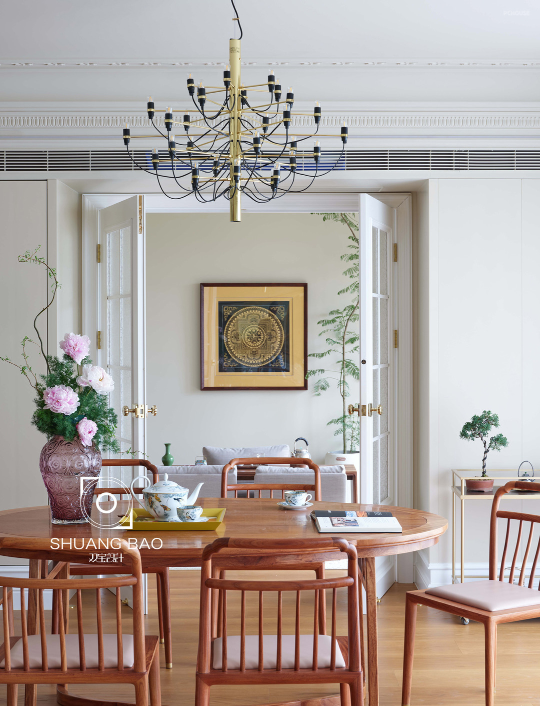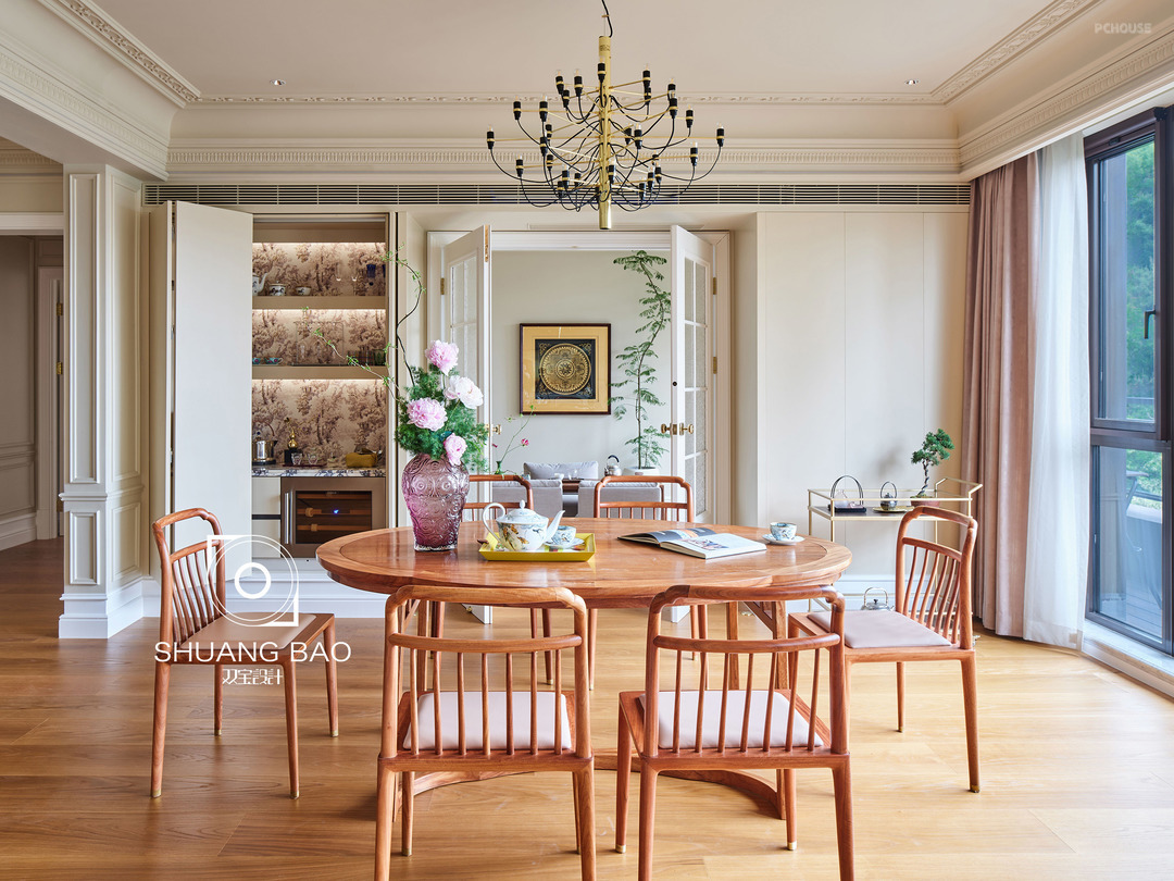 璞素的餐桌置于餐厅中心,紫檀木的材质让空间充满中式美学的雅致韵味,桌面以梅花入形,打破传统餐桌围坐的方圆陈式,可容多人团坐,聚而不散,颇有趣味,桌腿反切梅花形,整体营造出温婉儒雅的气质。围绕的扶风靠背椅将传统榫卯工艺与现代艺术相融合,凸显内敛沉淀气质的同时又不失摩登感,赋予空间多种文化艺术的气息