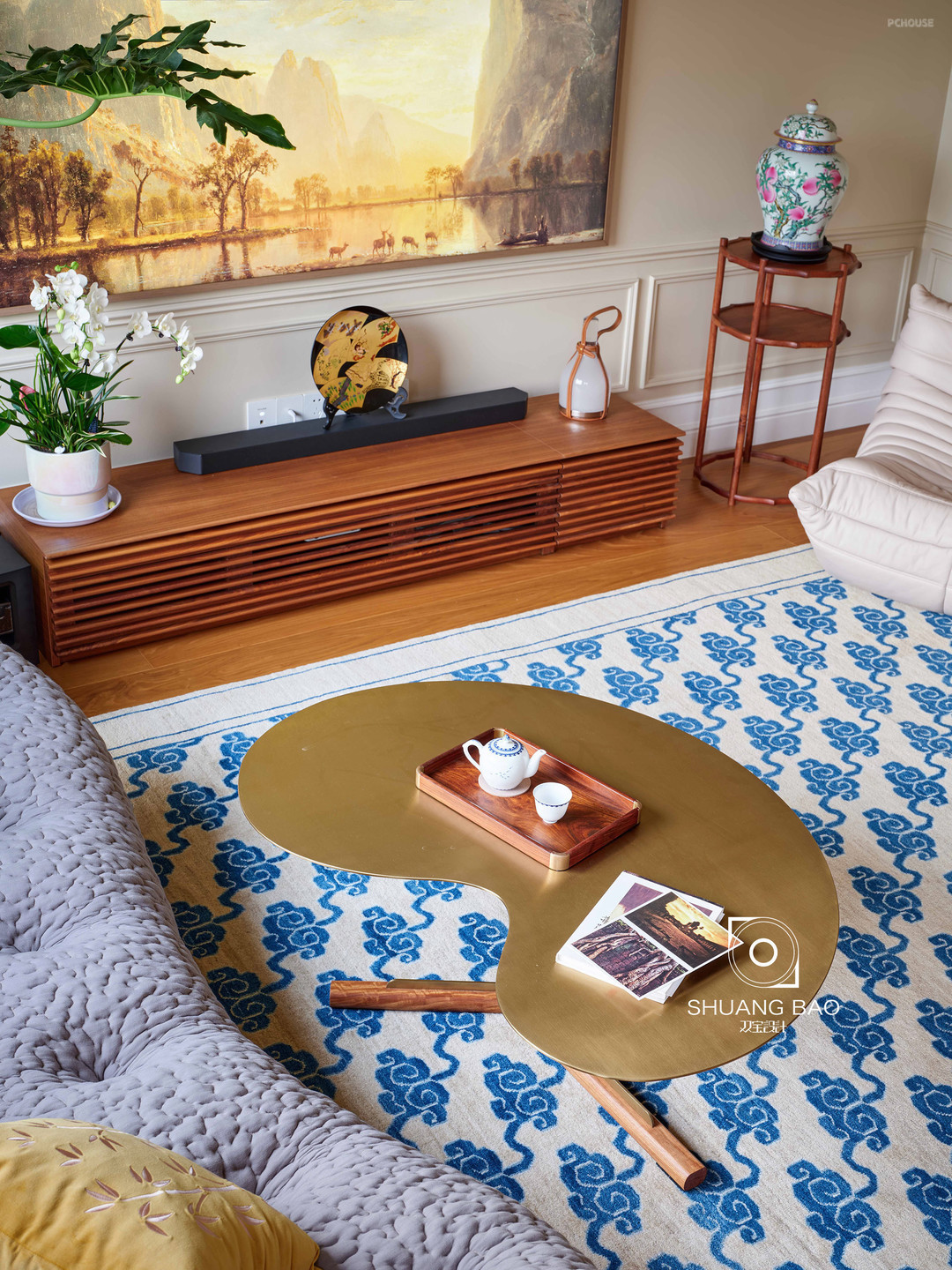 Ploum贝壳沙发与Togo相对而坐,贴近地面的高度拉近了家人之间的距离。ZAMANI手工羊毛地毯,使用中国风祥云图案寓意着福气,广袤曲折的云朵交错穿插、交织生长,呈现出一种快乐、和谐的气息,低饱和度的色调,淡雅不失端庄韵味