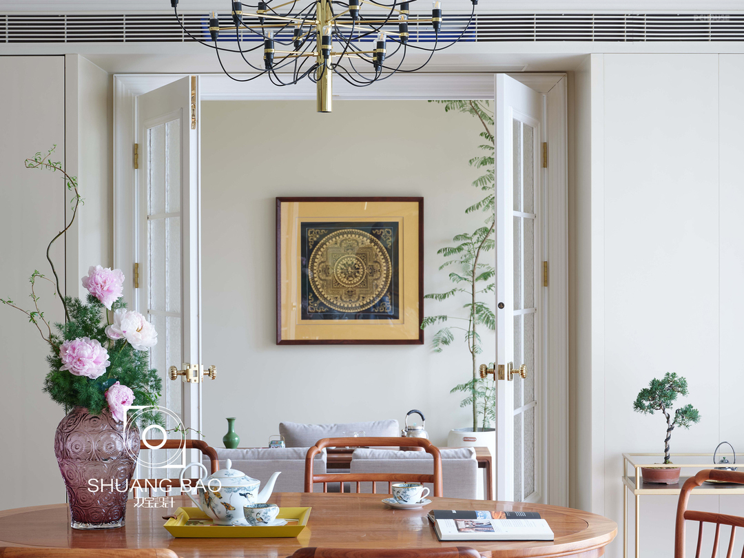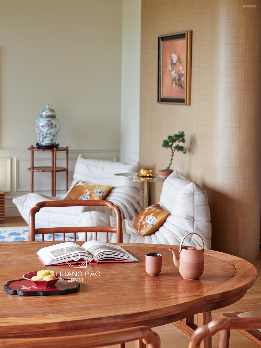 餐桌已不再局限于吃饭,一缕茶香,一瓣书香,惬意非凡。中式花架上摆放着女主淘来的徐窑将军窑,精致典雅,这也十分符合珠宝设计专业的女主人,她对空间的物品陈列有着相当苛刻的要求。客餐厅区域采用开放式布局,让动线更灵活,视野更开阔