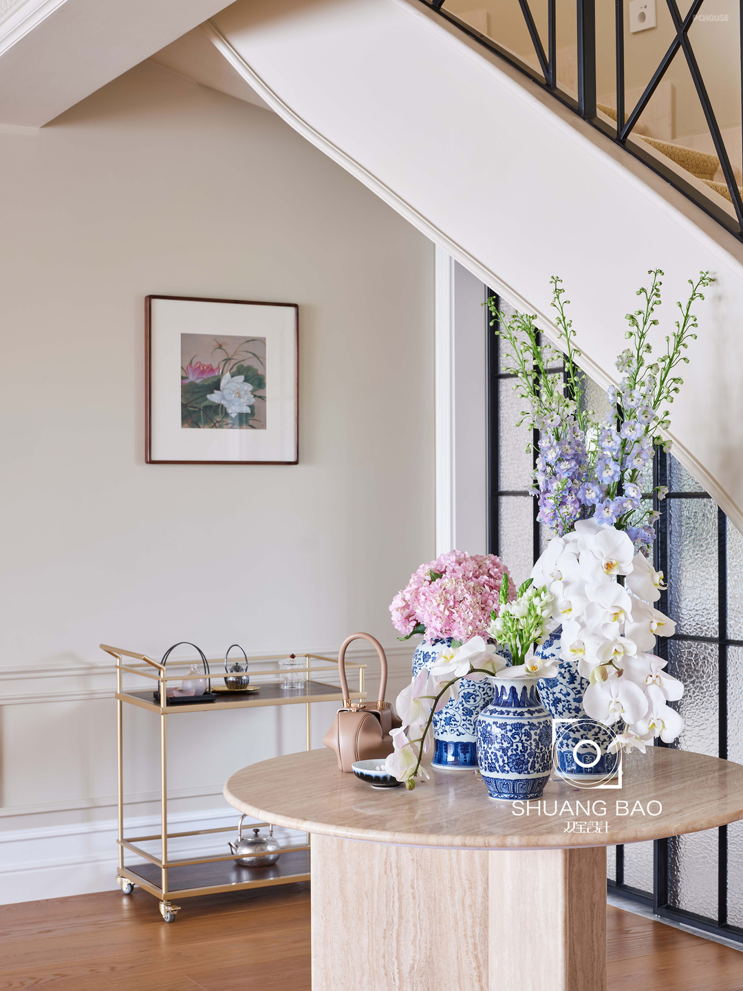 半弧形楼梯连接两层空间,流动的曲线给空间增添一份灵动,栏杆造型的灵感来源于百达翡丽,用时间记录生活,让每一份时光都成为这个家最美的回忆,老钢窗的材质使整体硬装造型上更显轻盈之感。水纹玻璃门透出朦胧之美,青花瓷配置的精心挑选的鲜切花,给予生活满满的仪式感