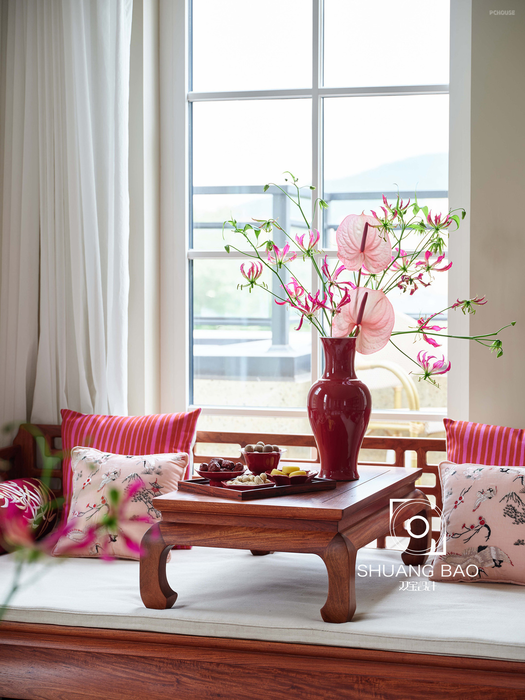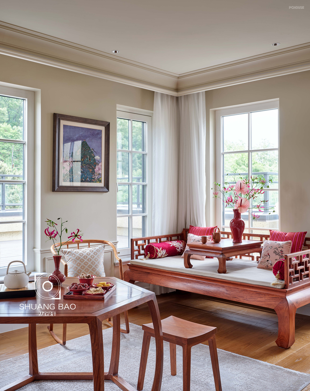 明清中式的罗汉床,精湛的工艺匠造出禅意的生活品质,典雅的造型构造出独特的中式美学,在整体上为空间增添了几分高级的气质。独处时可以翻动书页,静享生活的恬静与美好,休憩的角落,也成了微型艺术空间