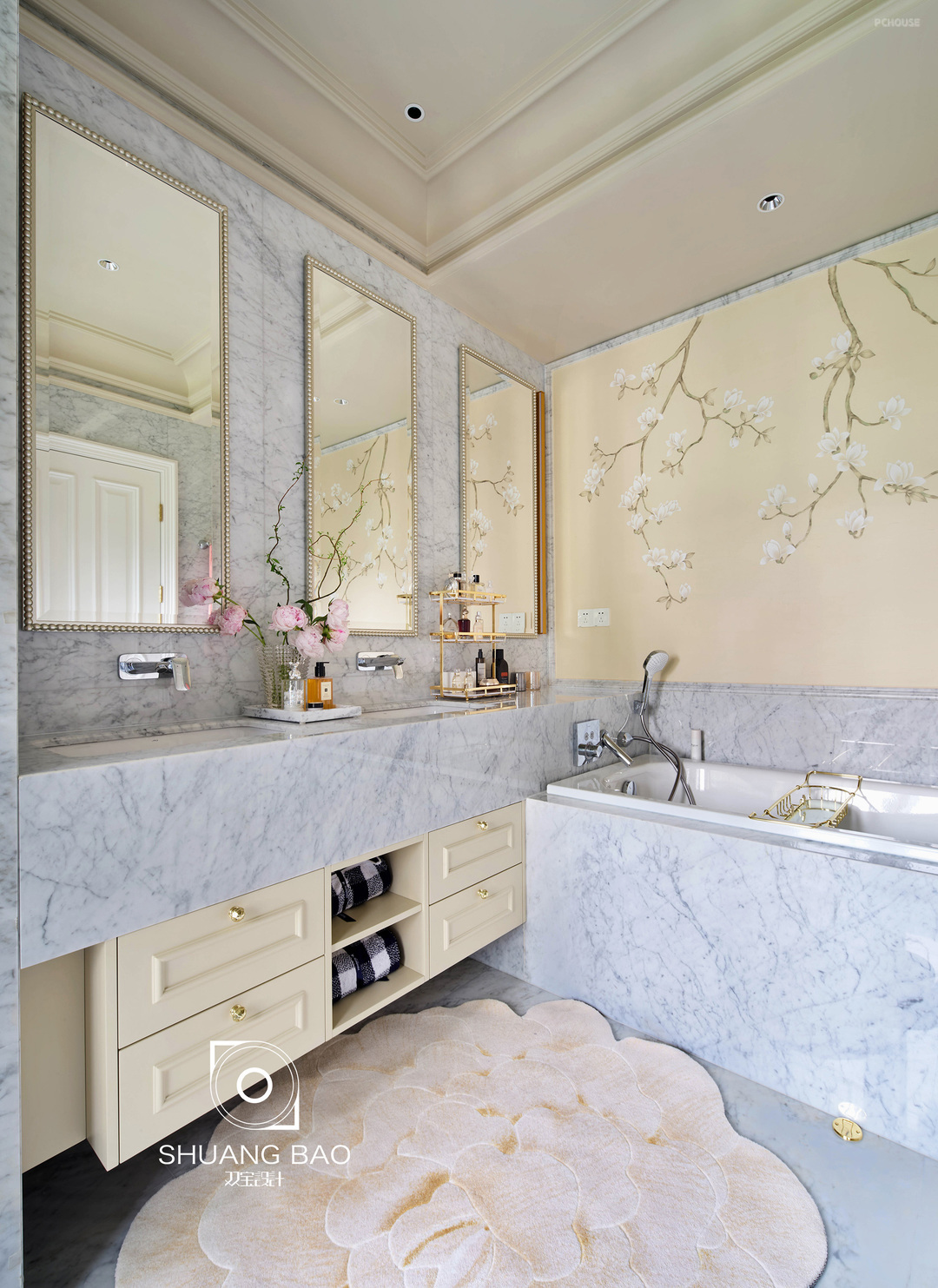 主卫整体空间干净整洁,采用干湿分离加双台盆的设计,大大提高了使用的效率与舒适性。选用细化白的天然大理石搭配玉兰花壁纸,温柔绽放的玉兰花布满下垂的枝头,顺着墙壁延展而下,把春天搬进家里,美好留在心头