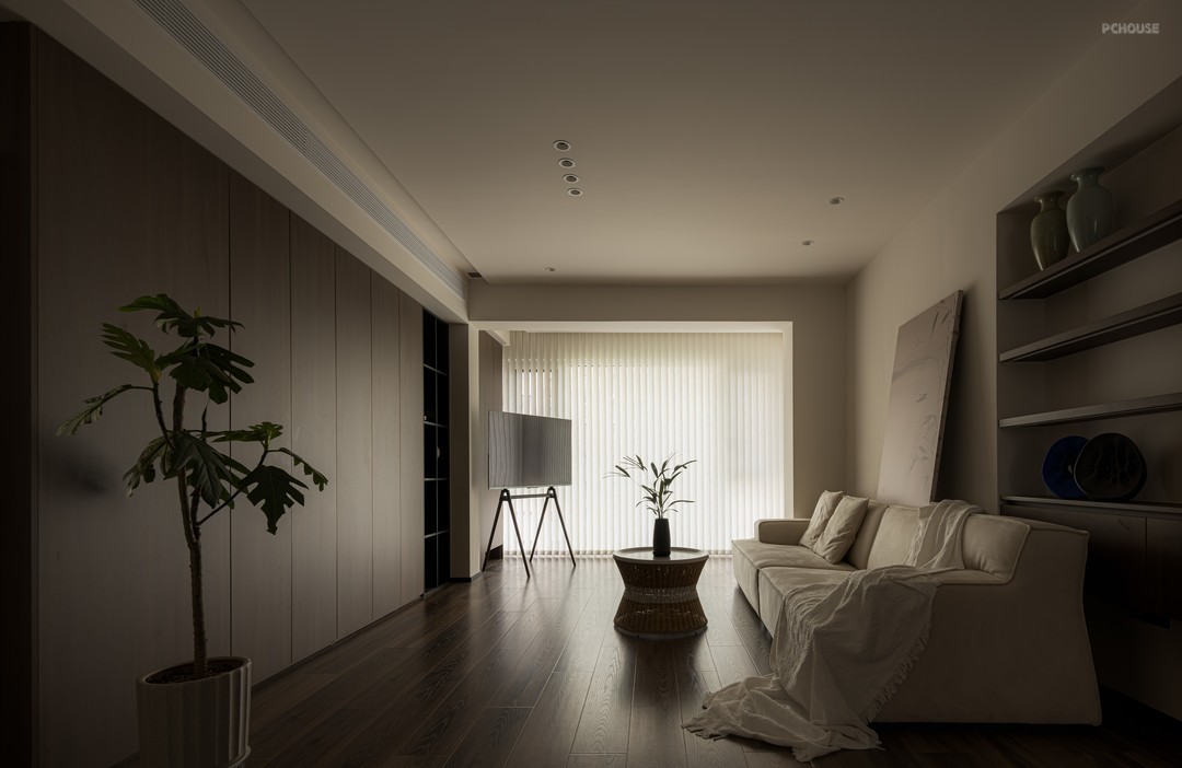空间里大面的使用了木质材料,细腻的氛围感透过柔和的木纹凸显出来,墙面使用米色的乳胶漆,浅色的块面留给视觉喘息的空间。