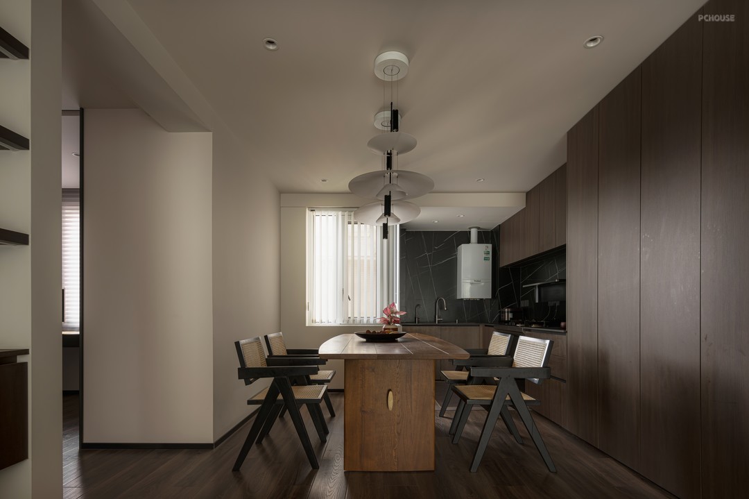 厨房在设计之初需要解决的问题是使用面积有限,也就意味着台面和储物面积不足,于是将厨房打开,将操作台面延伸出来,一排高柜也有效的解决了厨房和餐厅的收纳问题,整面的木色延伸到顶,木色与黑色岩板搭配出空间的美感。