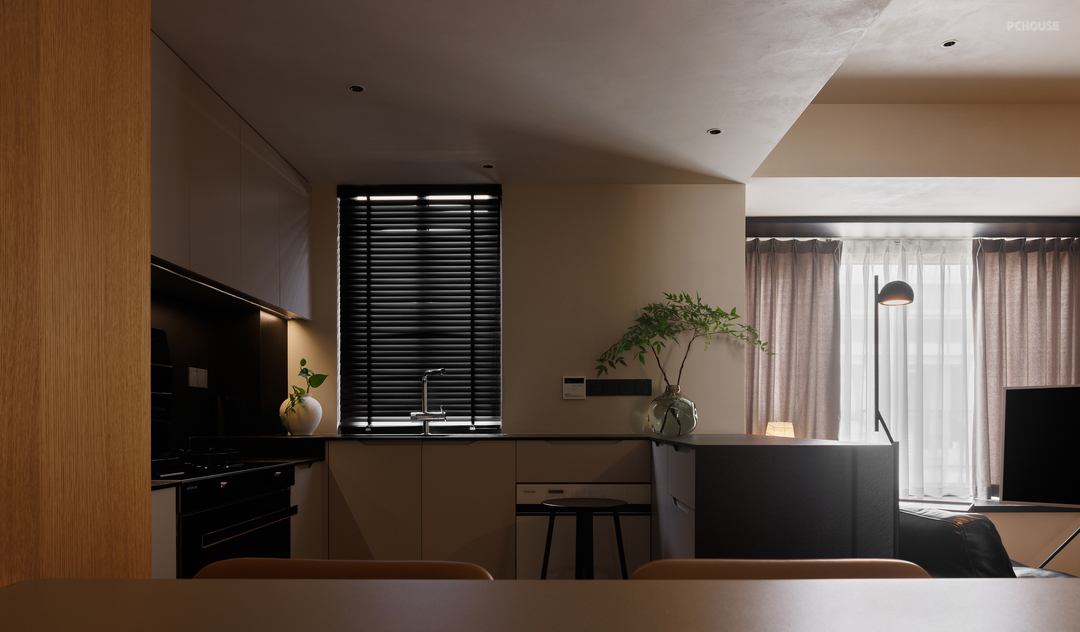 我们把厨房与客厅之间的隔墙拆除,变成开放式厨房。打开了客厅与厨房之间的视觉障碍,一进门的视野得到了延伸,让视觉空间感得到最大化;