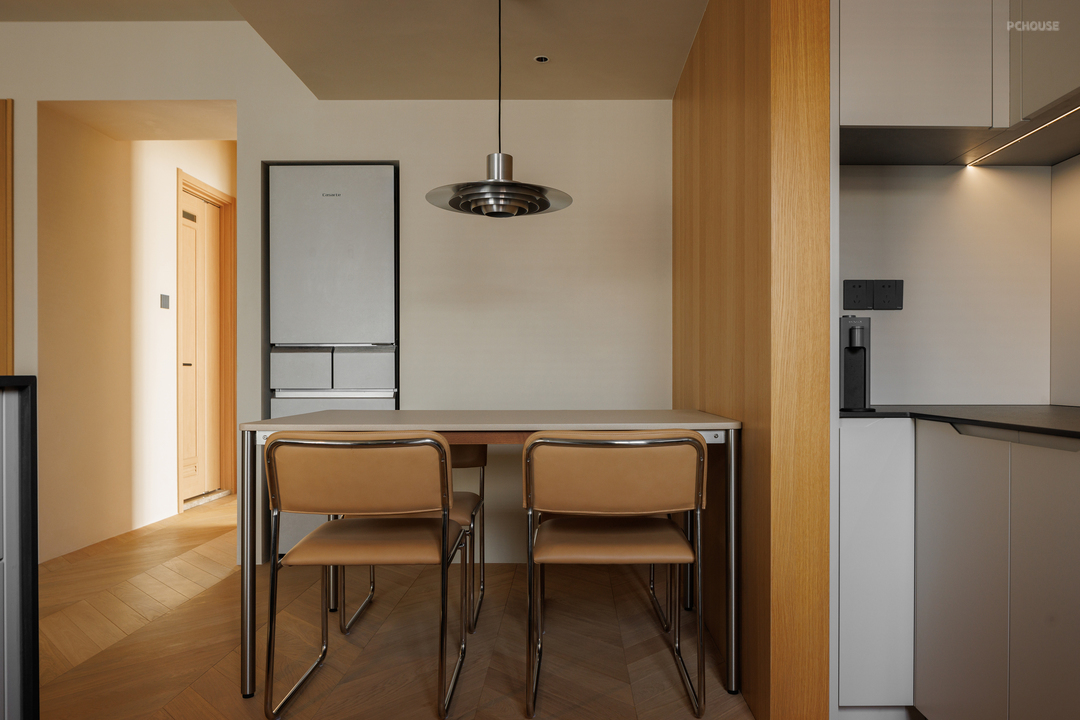 冰箱利用新砌隔墙藏在餐桌旁边,餐桌在做饭时可作为厨房的一部分操作台面中转使用,加上新增的转角岛台,让下厨从此不再感到局促;