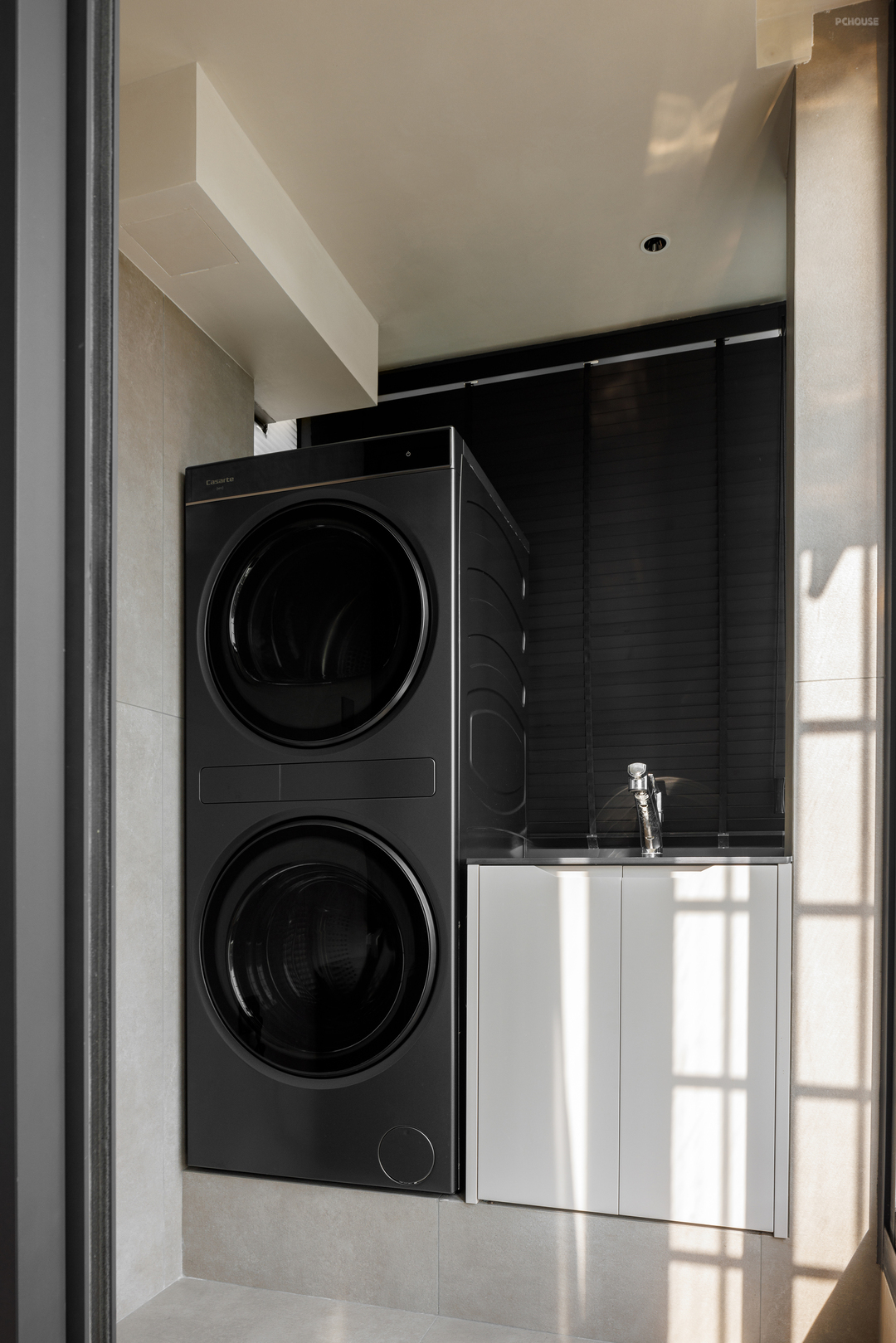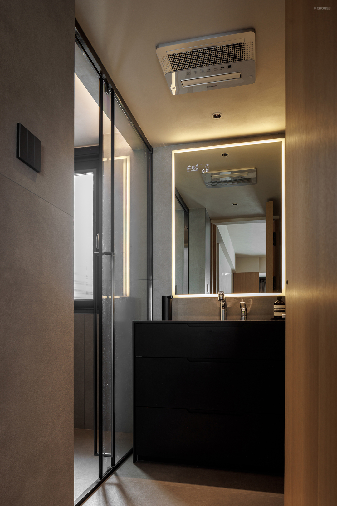我们重新规划了卫生间,一分为二。洗漱入口放到了入户边上,方便屋主回家后第一时间洗漱更衣。洗漱区选了两个大的黑色块,与浅灰色形成强烈对比,让空间显得更为干净利落。