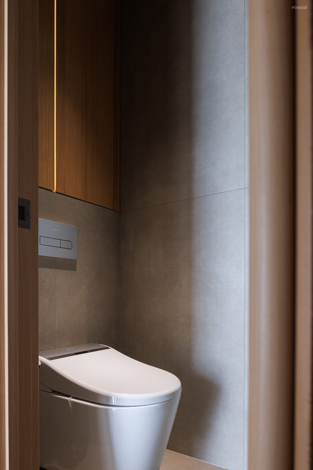 马桶间的入口依旧放在原有过道位置与卧室相邻,方便两个房间使用。做成二分离之后,也能满足同时使用卫生间的需求;马桶间内设计了小型洗手池,方便如厕后的卫生清洁;壁挂马桶半墙以上的部分也不浪费,房屋中心的柜子是日用品囤货的完美归宿。