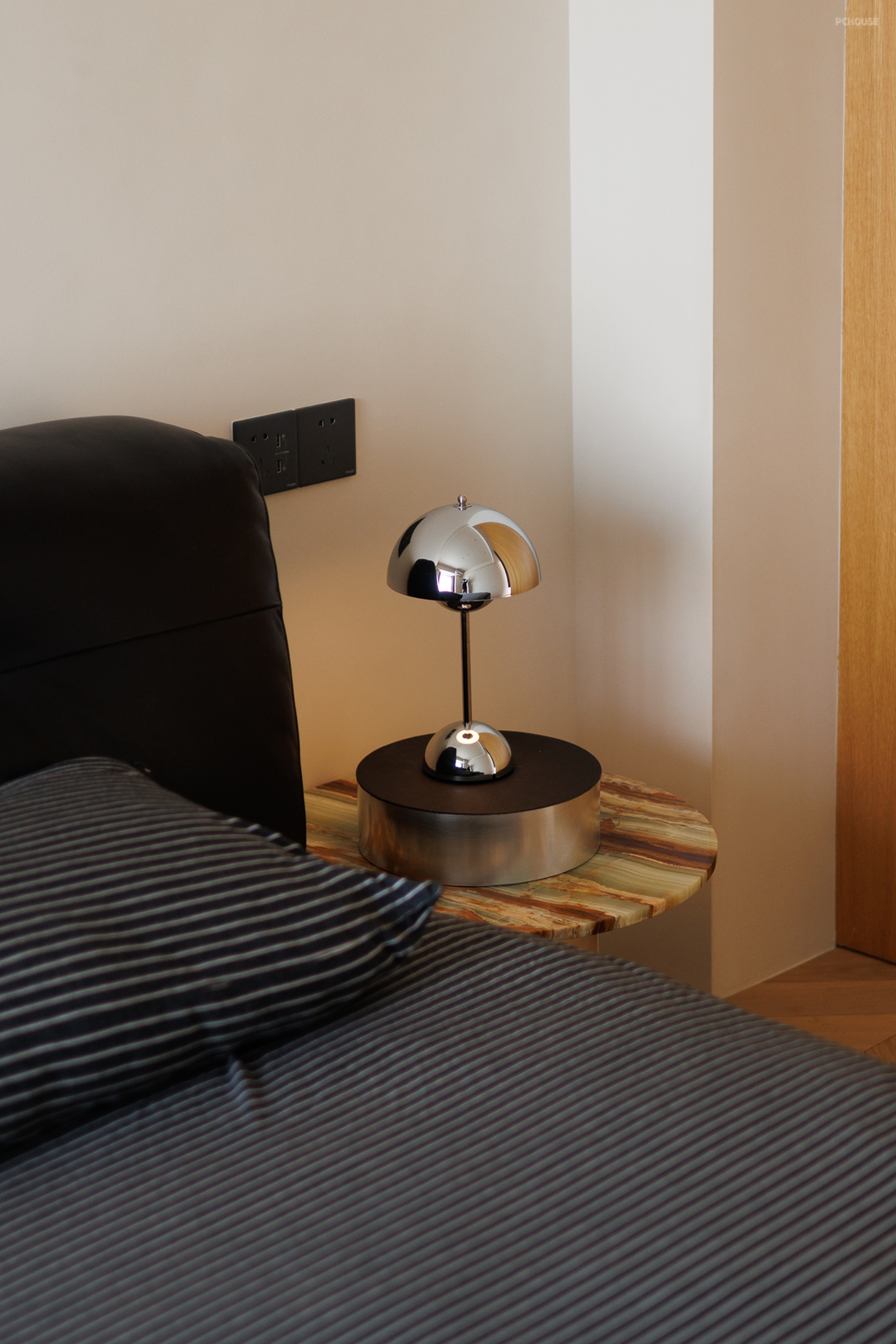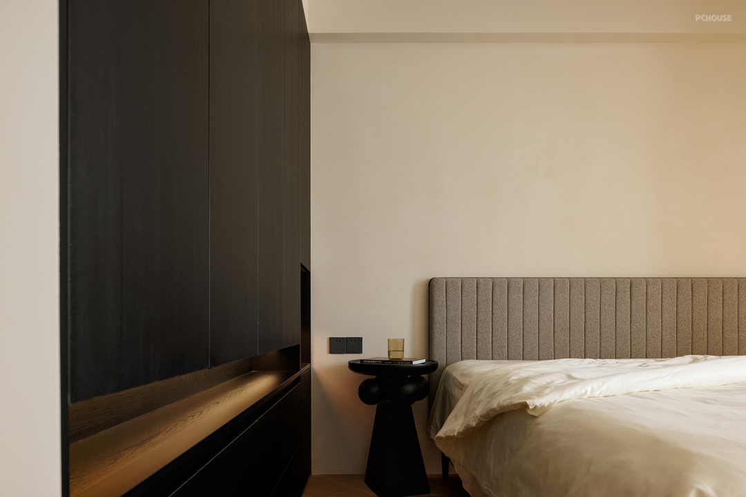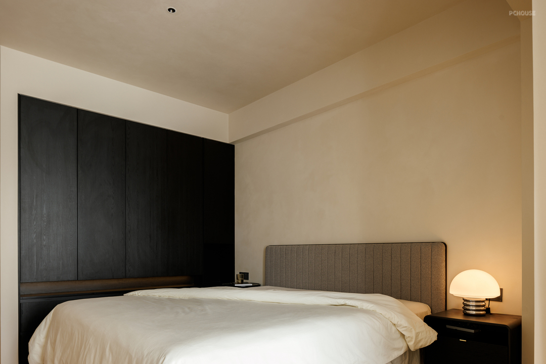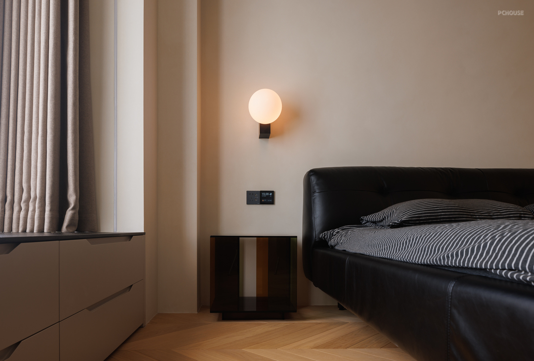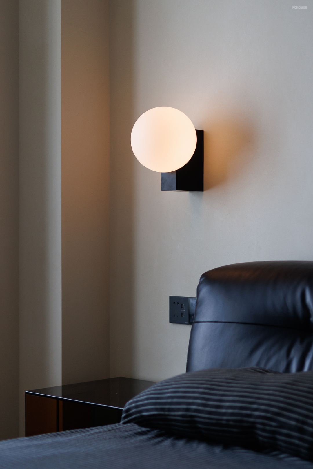 原有飘窗做成了储物空间,放置换洗的床品。小巧的灯具,让简洁的空间,多了一丝设计的精致。