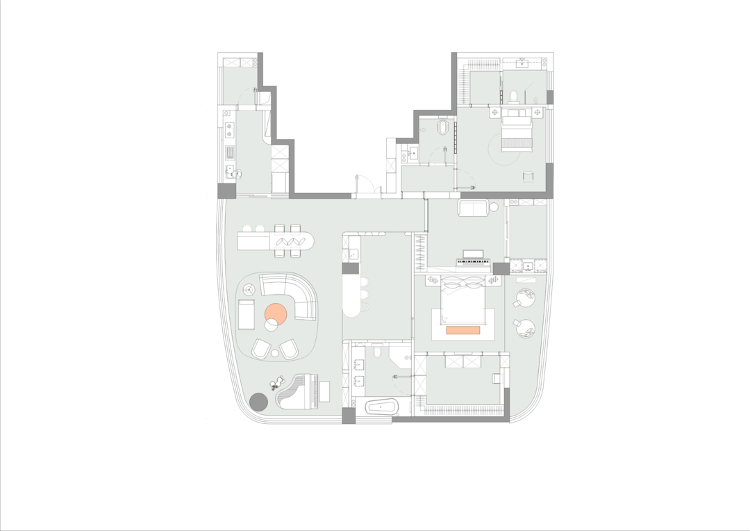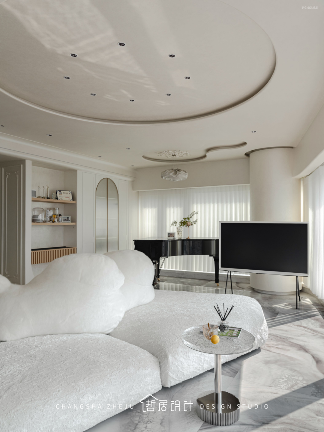 客厅的布置比较特殊,没有传统的电视墙,北极熊沙发,放在中间,可以实现客厅功能的多样性,可以躺着观看江景,可朝内与水吧区人员形成空间对话,还可以静静欣赏女主人钢琴表演,需要看球赛的时候另外一个方向可用支架壁画电视。