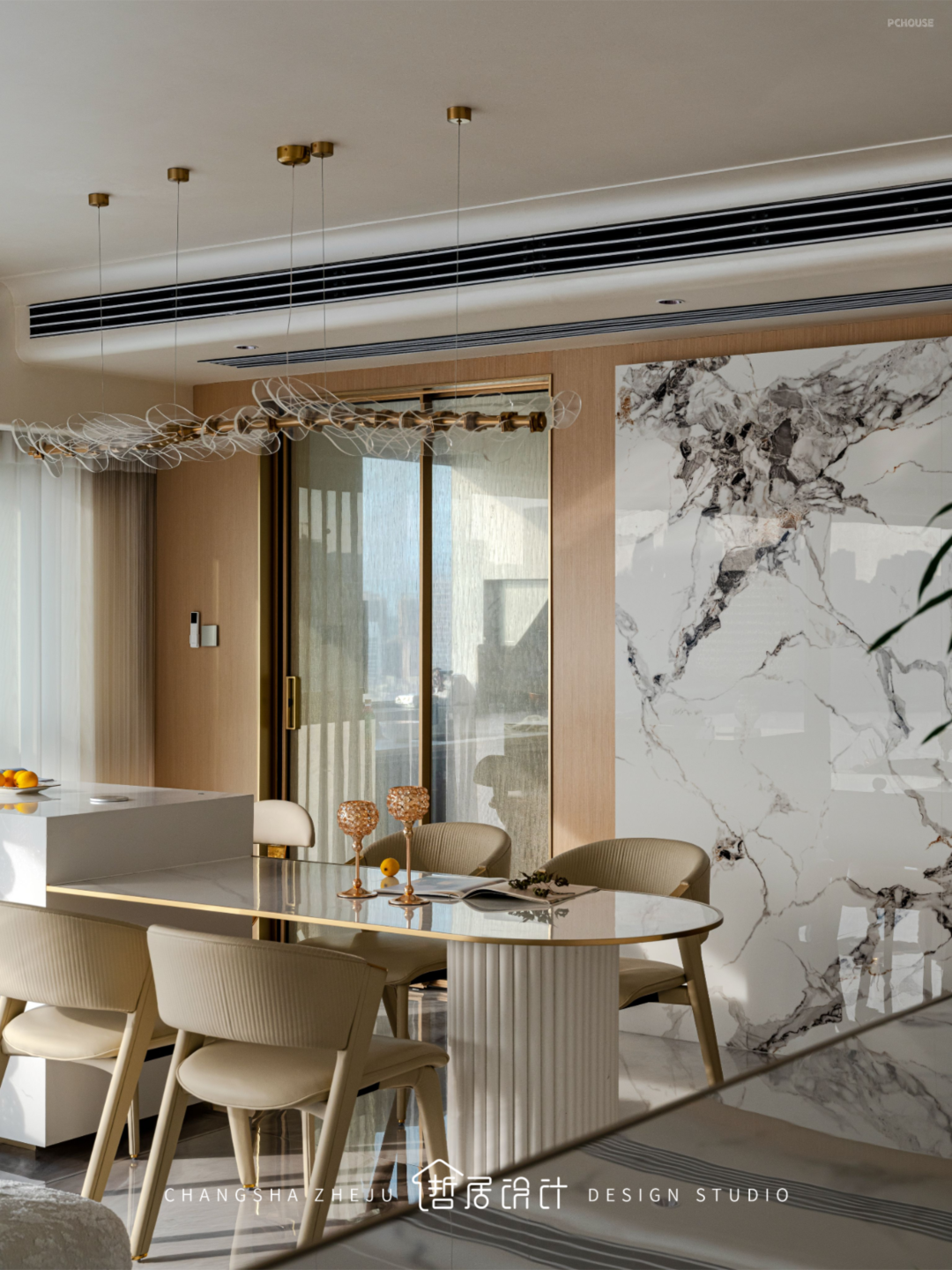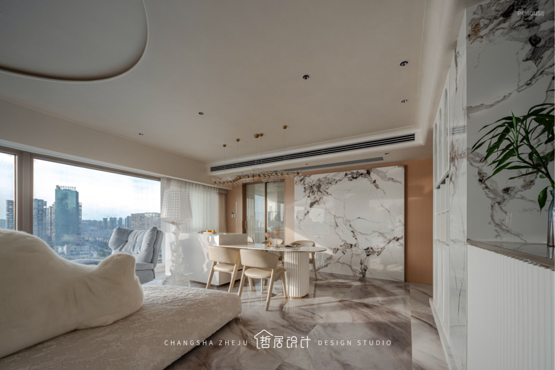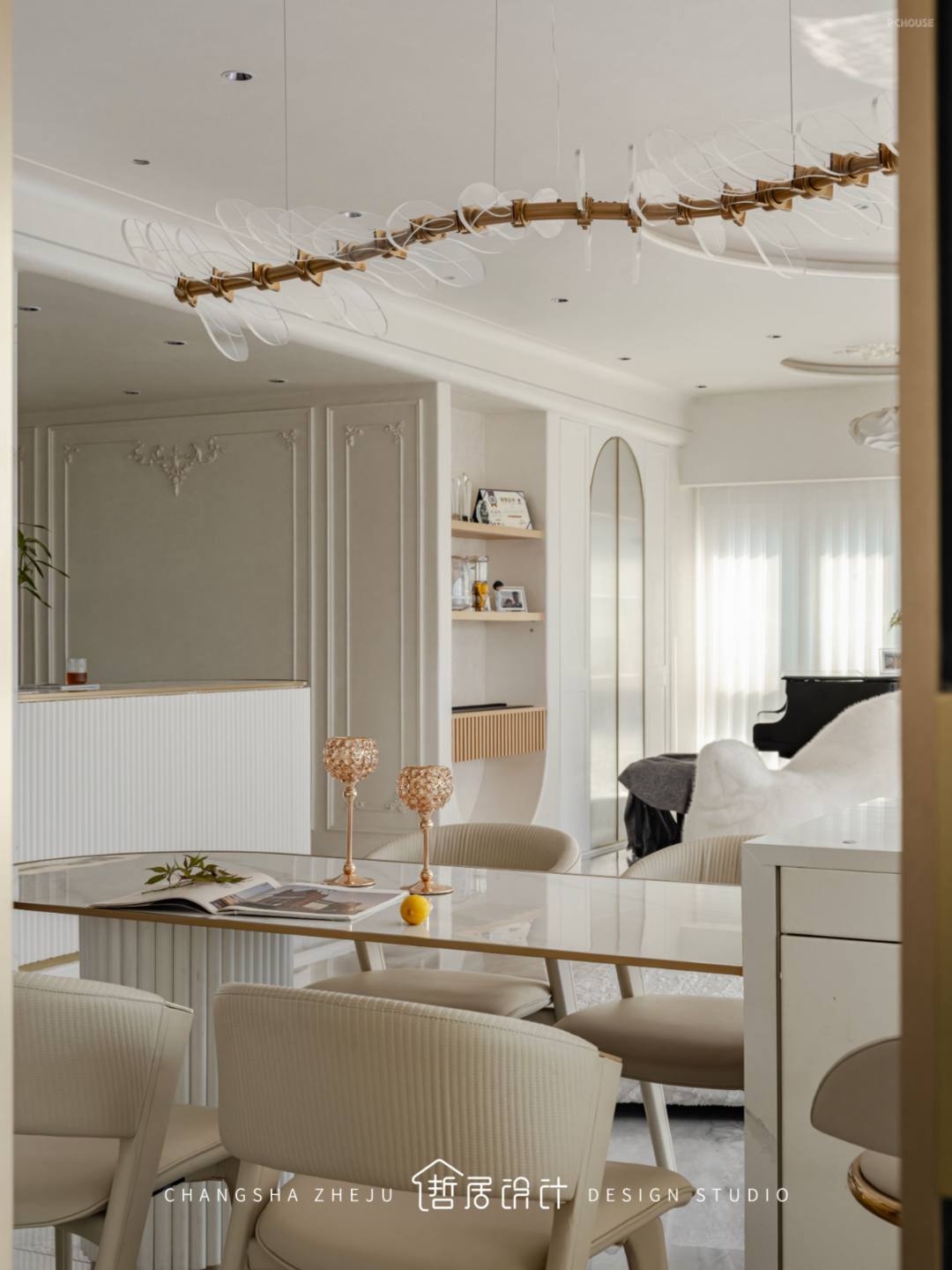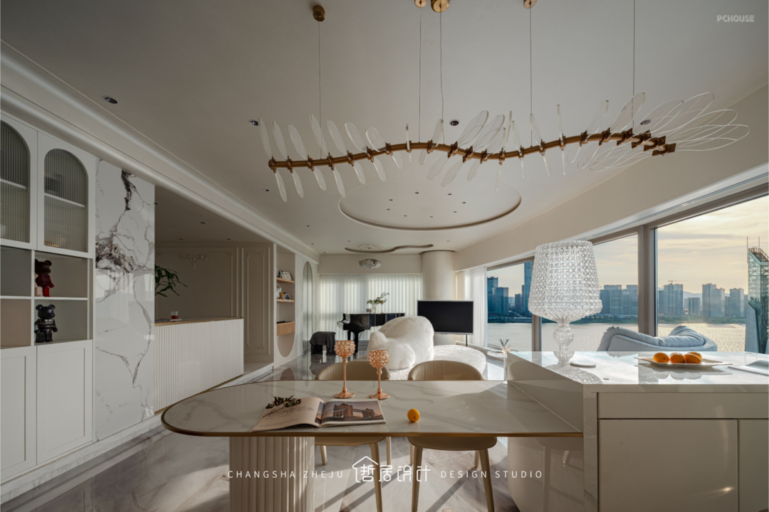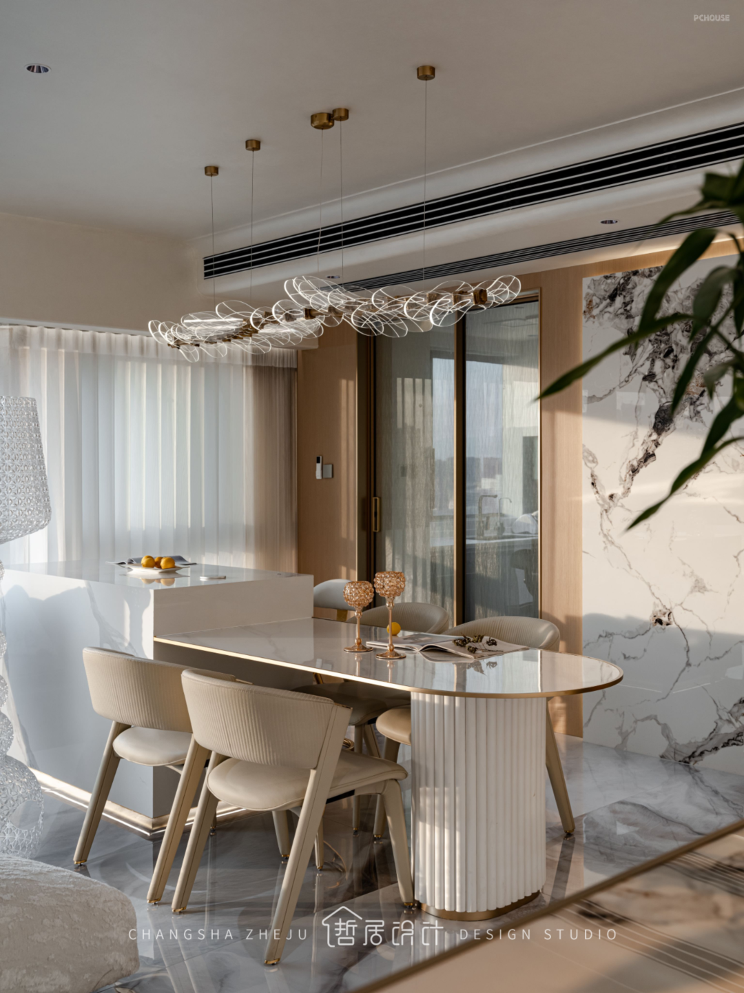 餐厅采用固定岛台加餐桌的组合方式,让其多功能的使用场景,同时增加餐厅边的收纳功能,整个顶面采用很多弧形元素的设计,让空间多了一份柔美的观感。