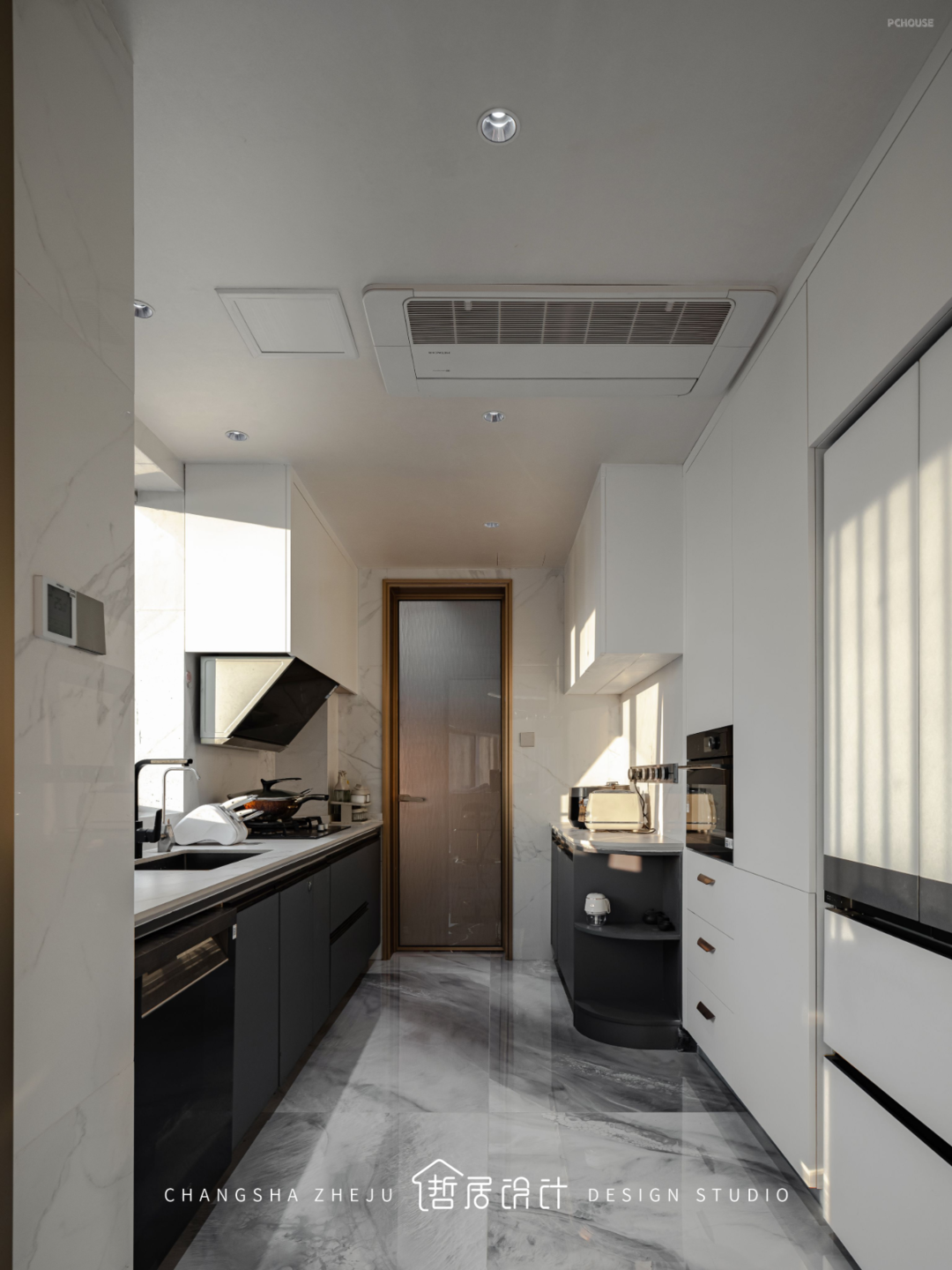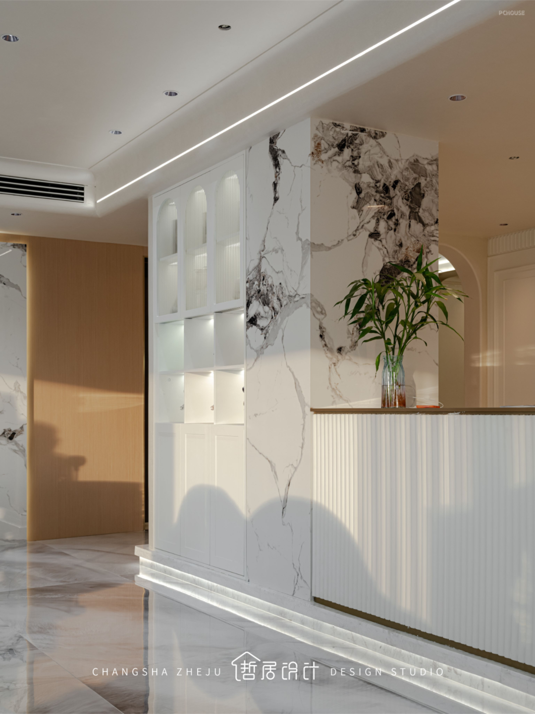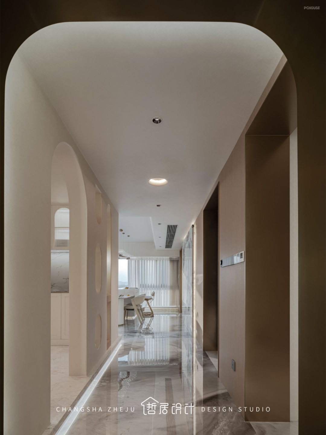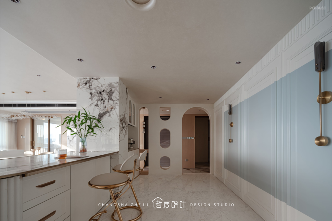 餐厅采用固定岛台加餐桌的组合方式,让其多功能的使用场景,同时增加餐厅边的收纳功能,整个顶面采用很多弧形元素的设计,让空间多了一份柔美的观感。