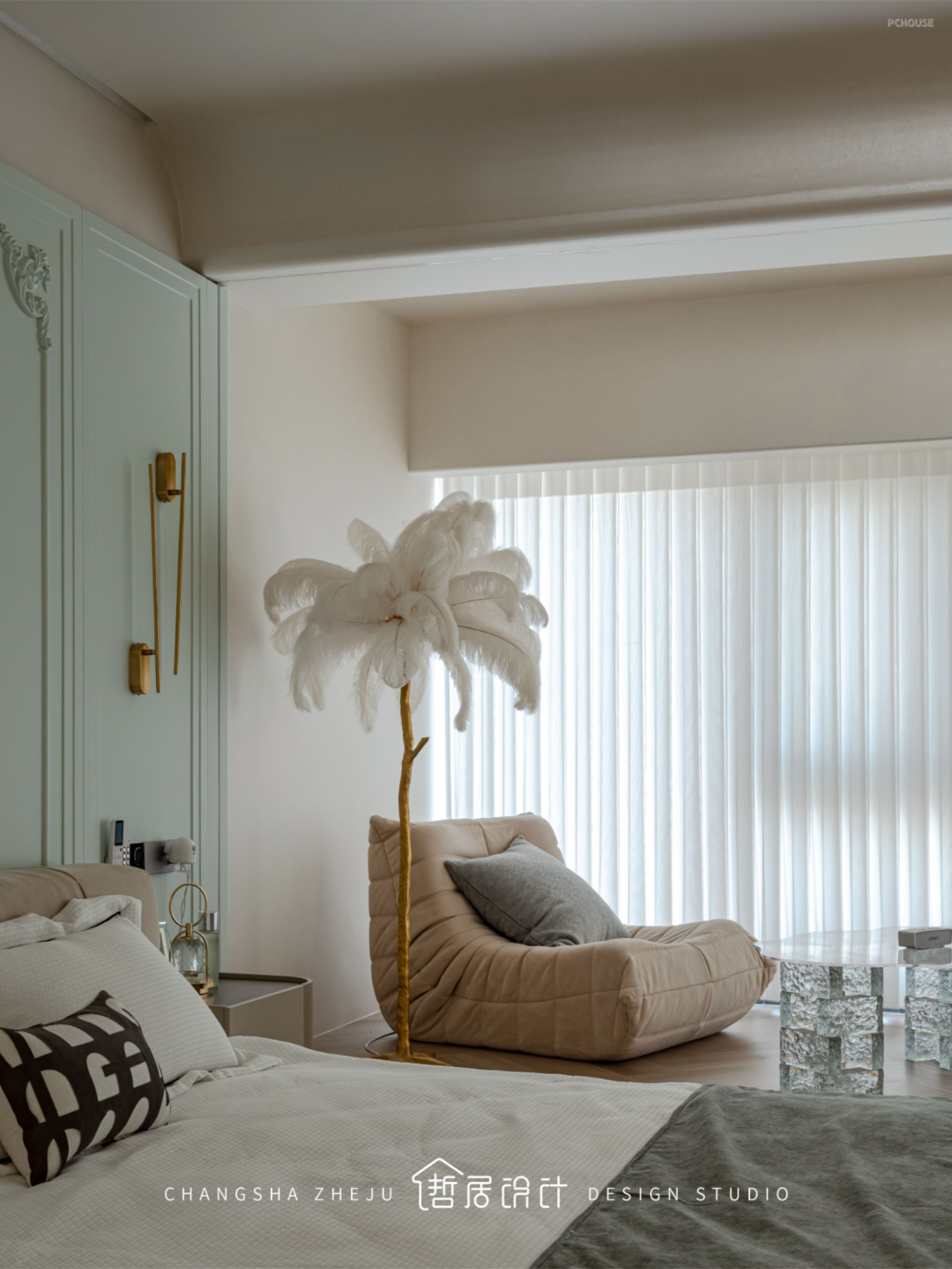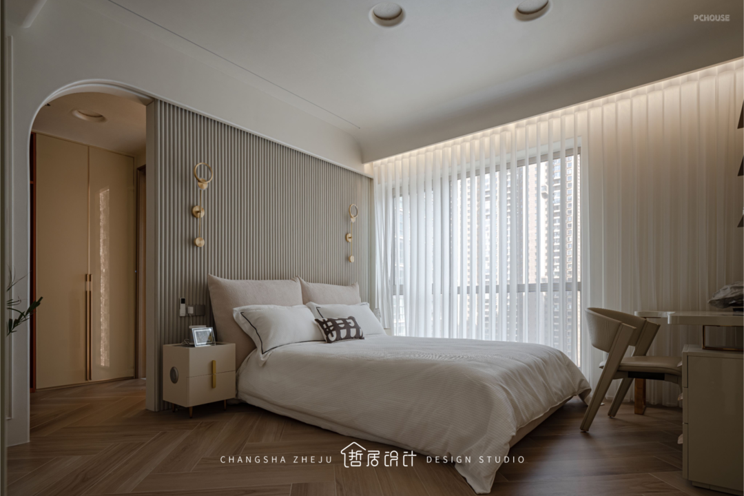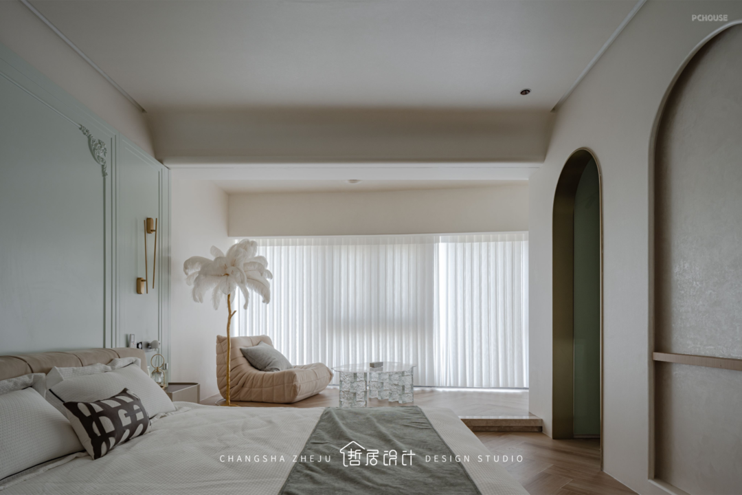 主卧把阳台纳入到空间,让主卧空间更加宽敞,同时也多了一个舒适的私人休息地方梁的位置用圆弧过渡,让他看起来不那么生硬。