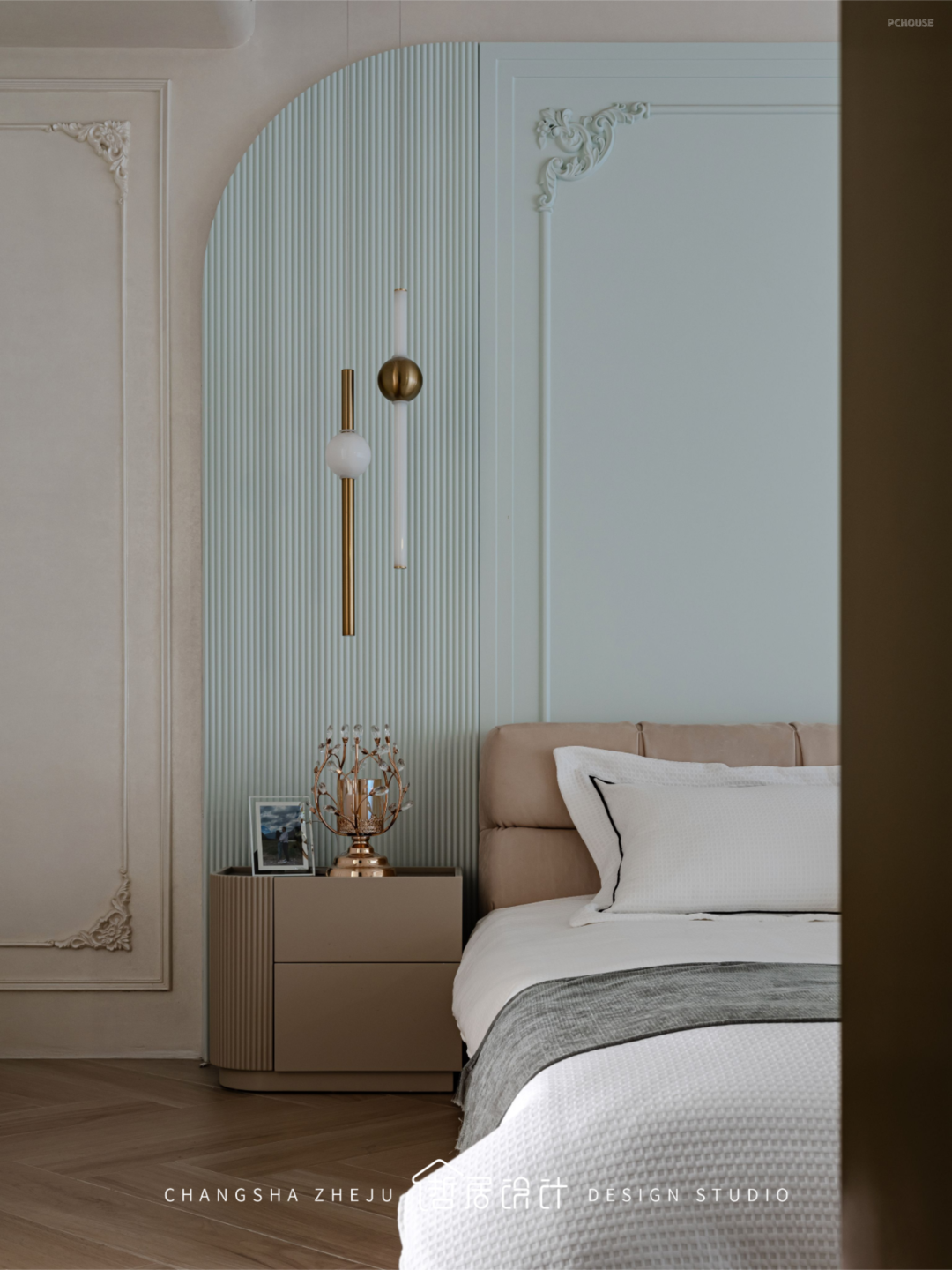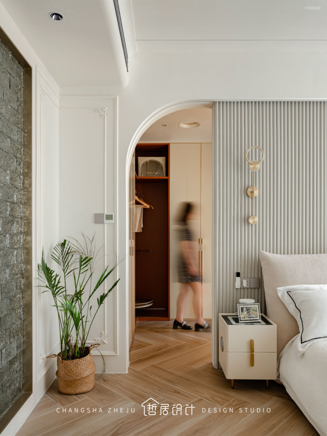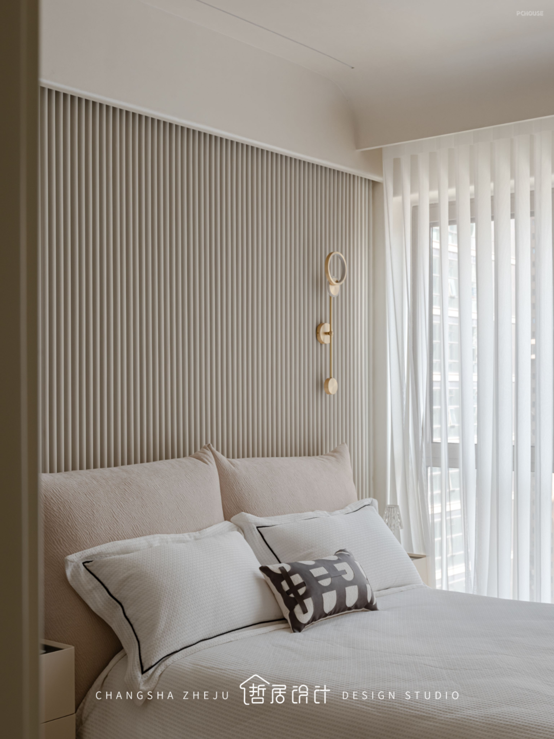 为将来小孩做准备用的房间,但是小孩独立居住前基本不会用到,父母来的时候可以居住。造型背景墙结合拱形门洞设计统一了整个背景墙面的同时也增大了视觉空间。