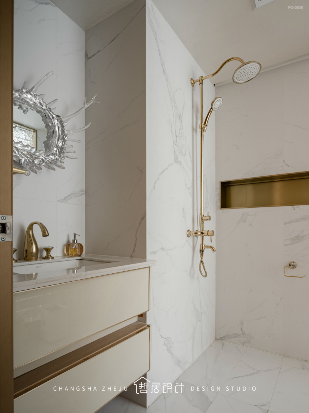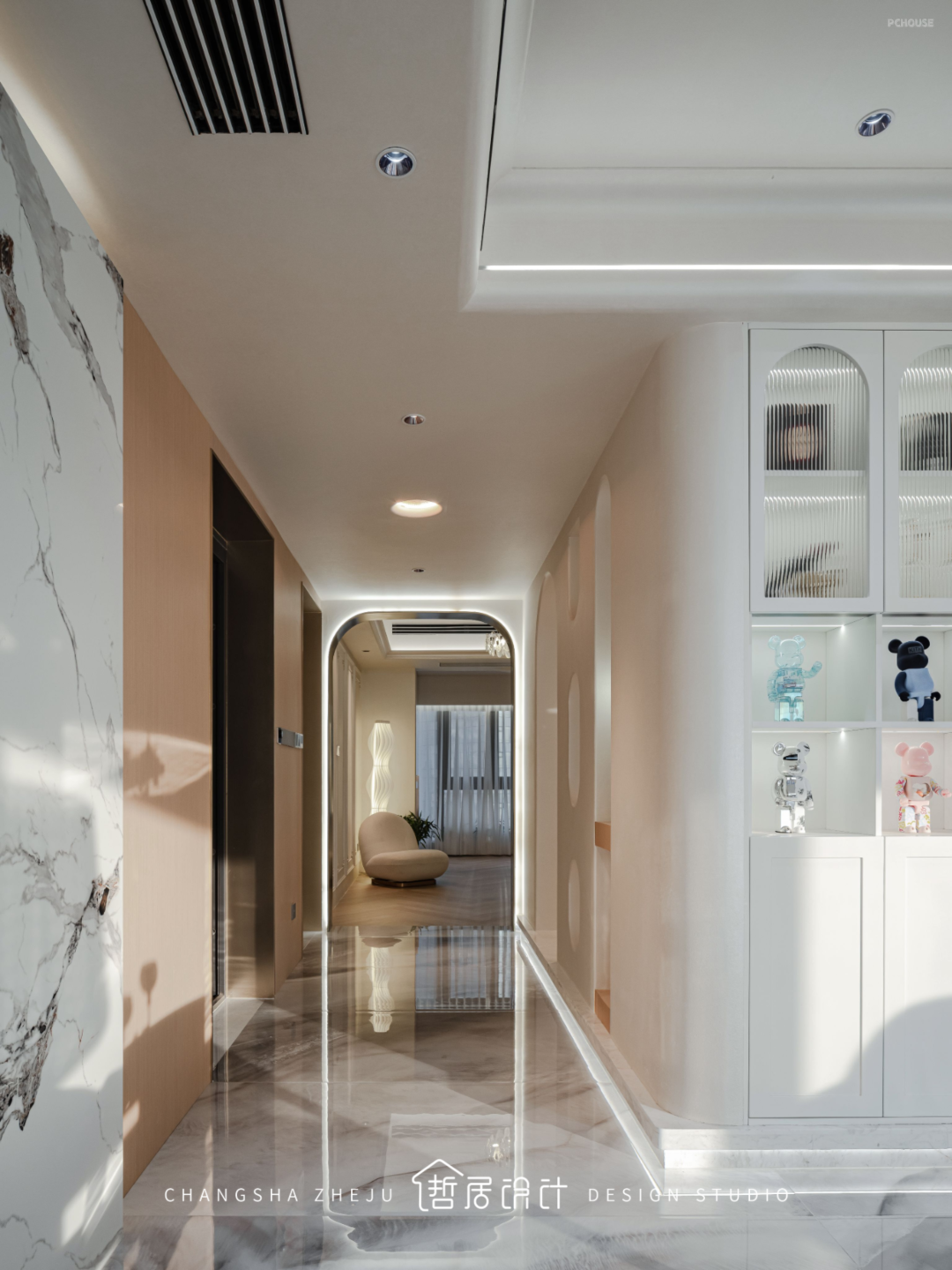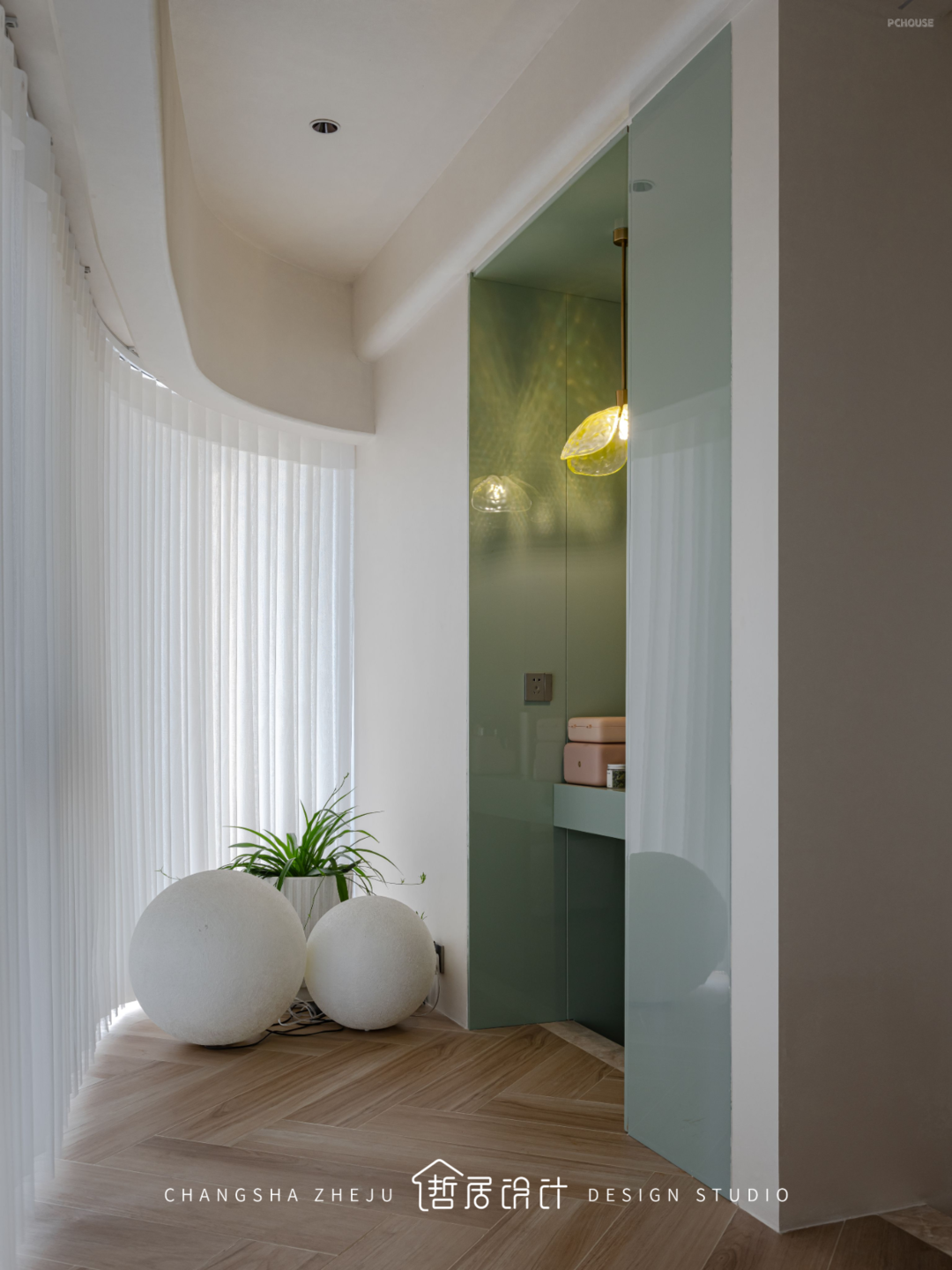 为将来小孩做准备用的房间,但是小孩独立居住前基本不会用到,父母来的时候可以居住。造型背景墙结合拱形门洞设计统一了整个背景墙面的同时也增大了视觉空间。