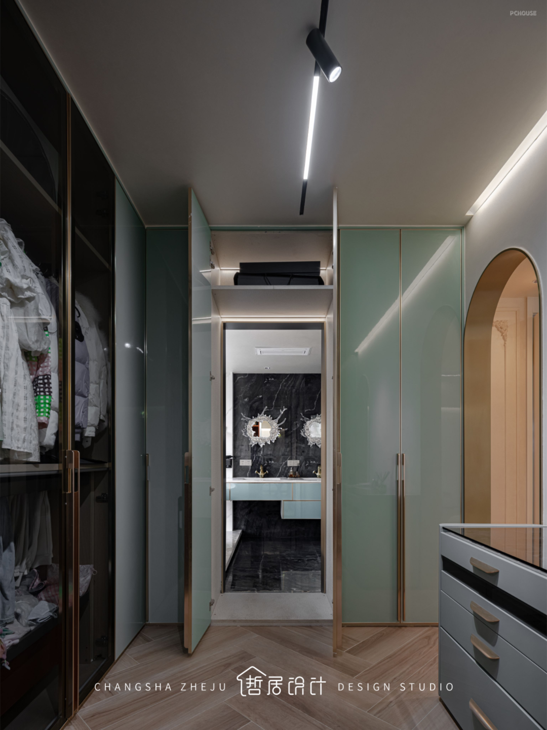 1.我们通过改造主卧的墙体位置,把主卧阳台区域纳入到主卧空间重新规划布局,让主卧满足正常卧室+衣帽间+卫生间的功能需求,让客厅多一个水吧,开放式公区功能,扩大的客餐厅的空间感受,也让多功能客房空间尺度增大。