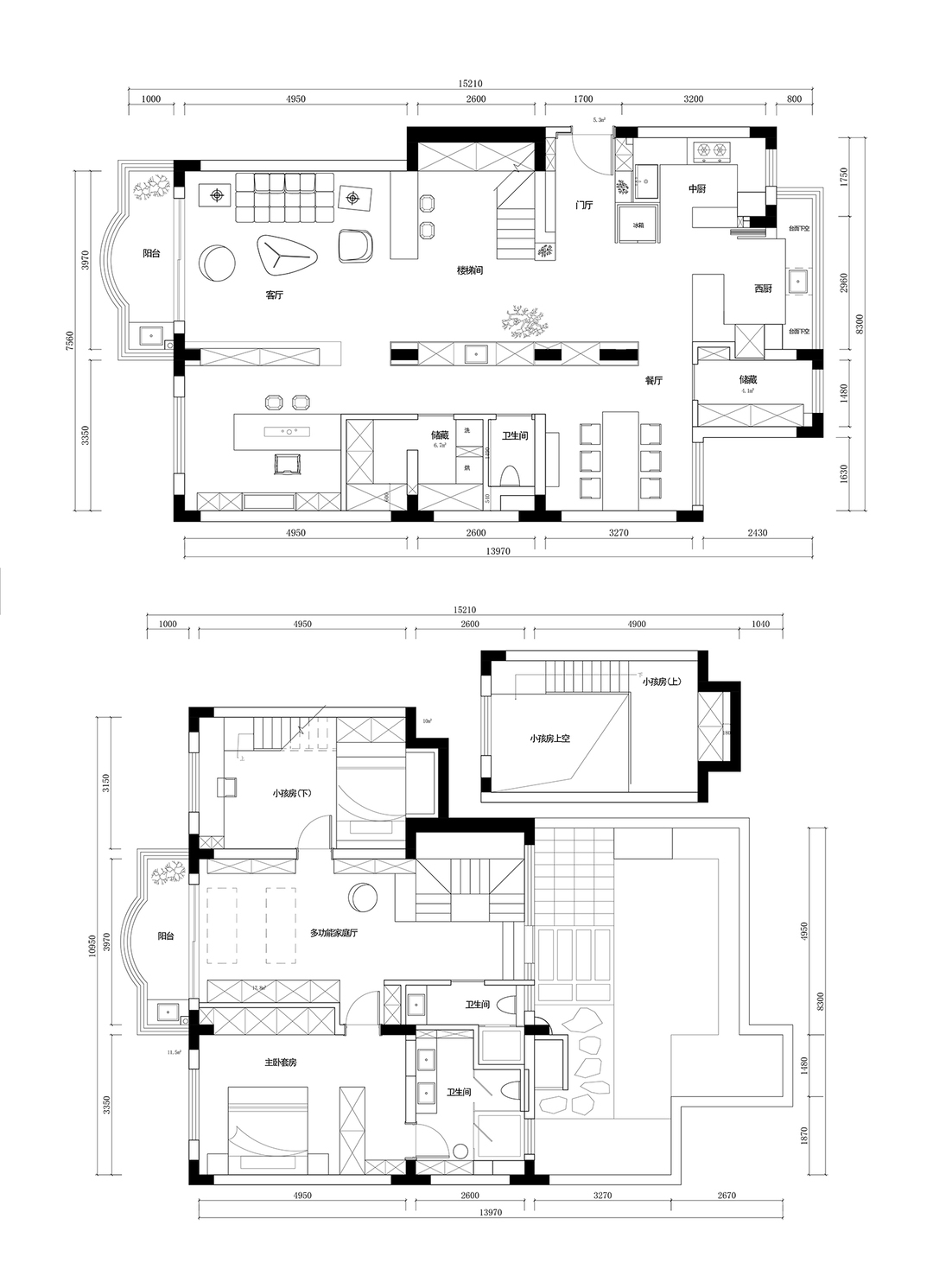 原始户型本身空间南北通透,户型很规整,一楼二楼都有厅,而且二楼的层高高,露台面积也大。