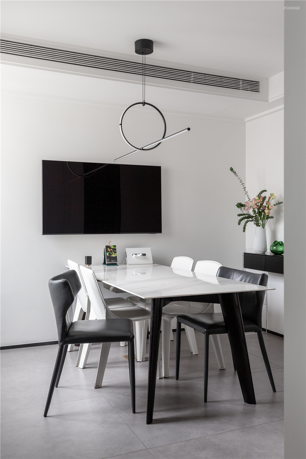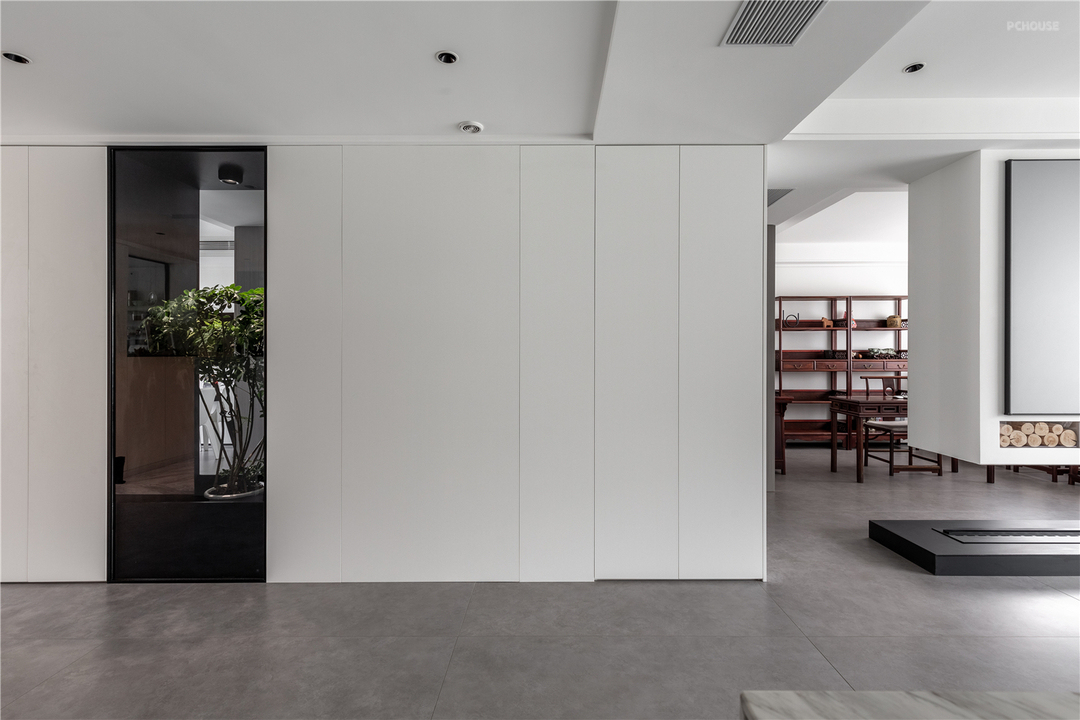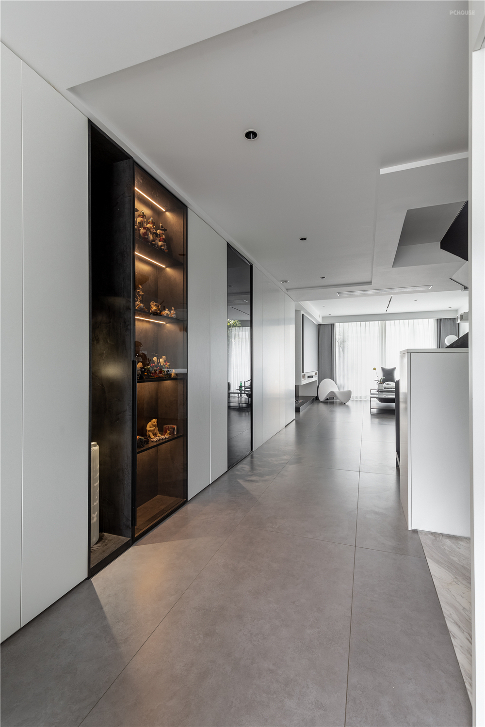 正对入户门的是一条6米长的芬萨定制柜,这个柜体的设计是亮点所在,有许多设计细节和小心思的组合。细长开放格,加摆件形成宣贯端景的视觉效果。
